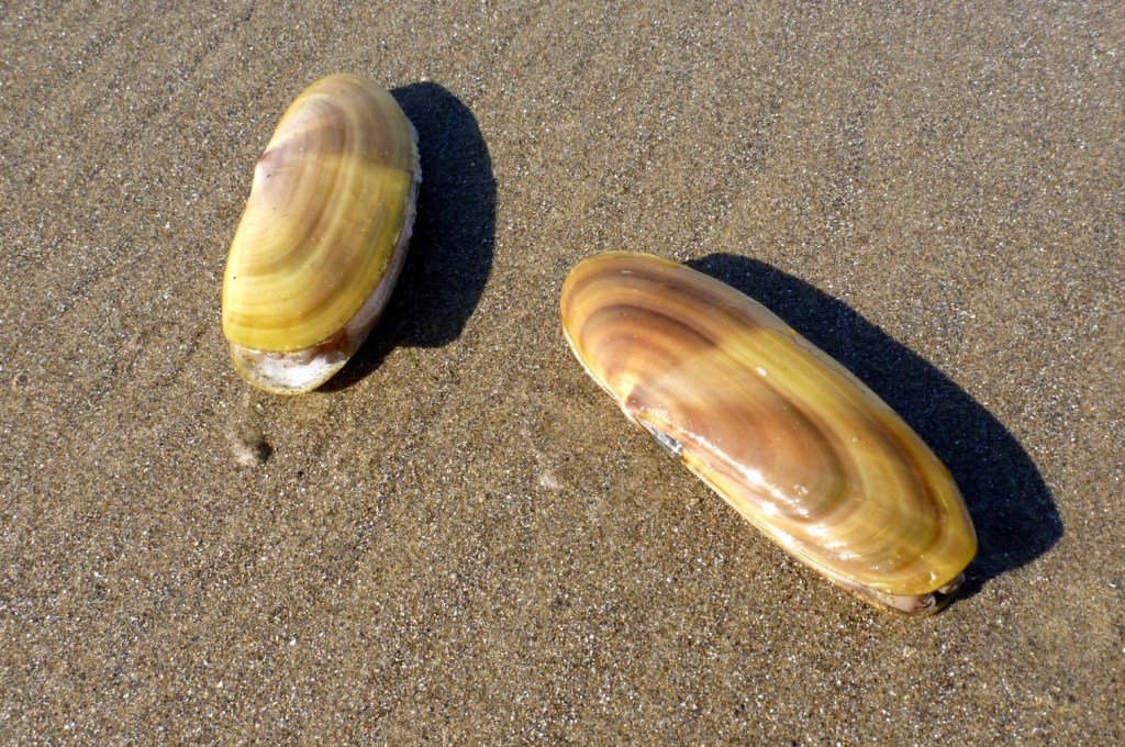 On September 26, 2012, I posted this photo on theoutershores’ Facebook page along with the message, “The early morning search for the purple olive, Olivella biplicata, begins here.” I took the photo on September 1, with a low morning tide of -0.2′, and I expected to walk out toward the breakers and take pictures of the purple olive Callianax biplicata in the great morning light. But unfortunately, I didn’t report what happened. What happened is this: I didn’t find any purple olives, and in the nearly eight months since I took the photo, I didn’t encounter a single purple olive.