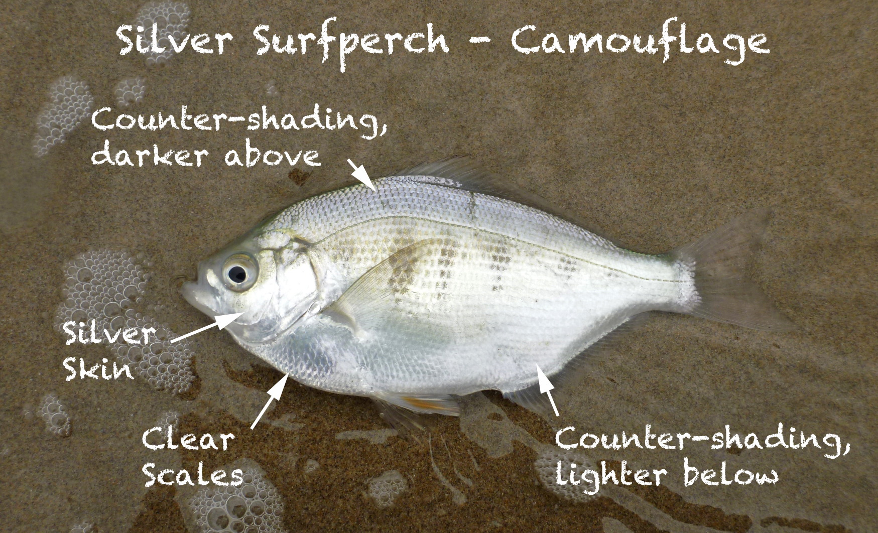 Surfperch are prey too. The silver surfperch, Hyperprosopon ellipticum, blends in to the sandy background a little differently than the prey shown above. Silver surfperch have silver skin, clear scales and counter-shading. Silvers are like little swimming mirrors. If you want to find out more about how silvery fishes blend in, check out hiding behind mirrors in Camouflage Under Water.