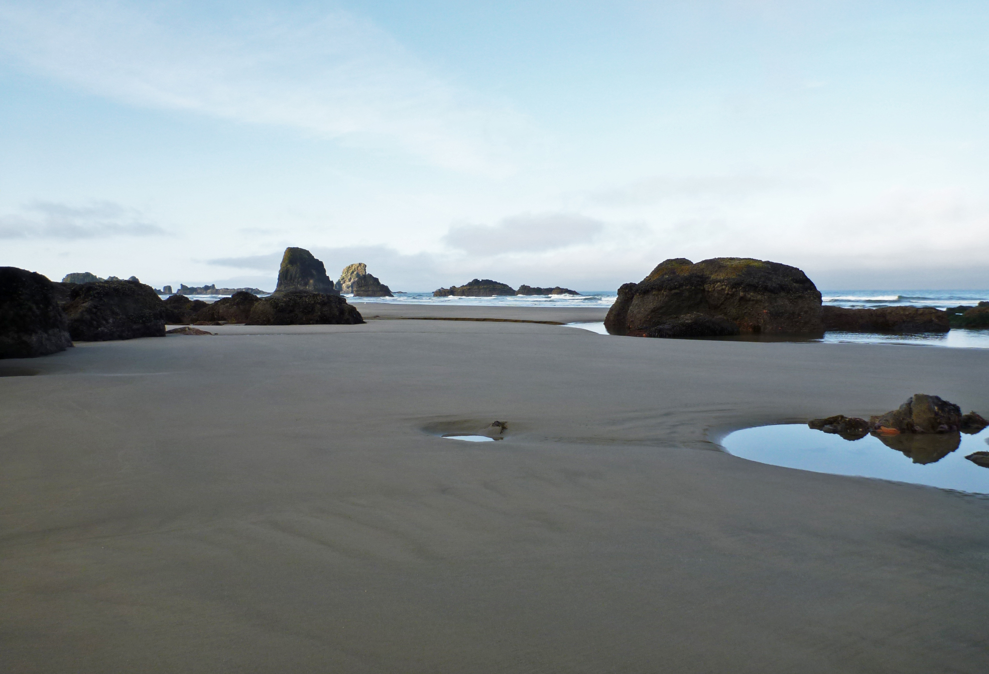 In happy instances where rock and sand are interspersed we can see indications of tidal zonation not evident on a purely sandy beach. The photo above shows a rock jutting out of the sand on one side of a low tide pool. The tide in this scene is just less than two feet below mean lower low water. Check out the brown algae along the bottom of the rock. To get oriented, it starts on the left by the large sea star and extends along the bottom of the rock all the way out to the tip. That’s dense-clumped kelp, Laminaria sinclairii. You can be sure that the rock it’s living on is jutting out of a sandy beach because dense-clumped kelp is partial to sand scour. Ouch. One other thing about this photo; the top of the dense-clumped kelp is just about mean lower low water. You’re not going to see Laminaria above this level. It’s a great landmark and if you see it you can be sure you are in the low intertidal zone, or what some people call the infralittoral fringe.