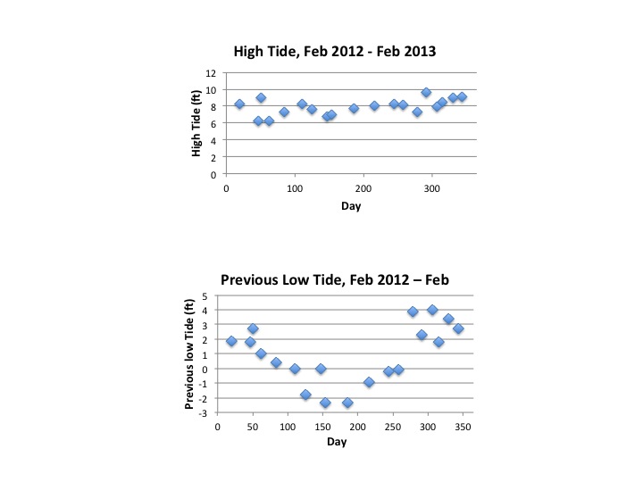 I have already shown in And the King of the Surf is…, that among TOS surf-dwellers, redtail surfperch, Amphistichus rhodoterus, are the most abundant, so that’s a good place to start evaluating the relationship between abundance and the tides. Below I plotted high tide and the preceding low tide on days I fished from February 2012 to February 2013.