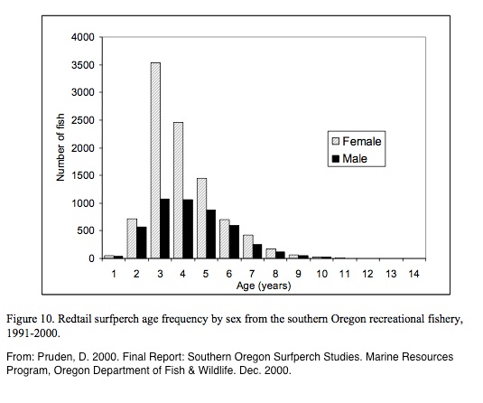 My first observation about the composition of the catch is the high frequency of adult fish in the August and September catch. To a fisherperson this means a higher proportion of bigger fish. That’s what fishers want, right? If you hang out on the beach much you know that August and September is prime-time for redtail angling. This is the period when you can expect more bigger fish in the surf, so it makes sense to see more angler effort in August and September. There is one interesting difference between Pruden’s results and mine. If I’m reading it right, Pruden’s Figure 10 (above) shows that females are more prevalent in the catch whereas my catch is generally dominated by males. Maybe I can explain the female-bias in Pruden’s sample. Pruden’s Table 3 (above) reveals that females are bigger than males at all ages. Recall that Pruden got his sample from anglers. Is it possible anglers high-grade the catch, releasing smaller fish which tend to be males? It’s a possibility, but the male-bias in my sample begs a different explanation.