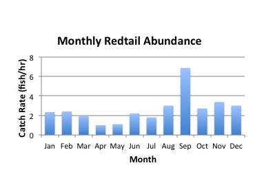 Before I discuss these results, there are two pieces of background information worth mentioning. First, females give birth, in the surf, to live young between mid-August and mid-September. Second, my sample sizes are kind of small so I don’t want to make too much out of it. The chart above summarizes my observations of 185 redtails; a small sample, but until somebody comes up with a better characterization, it’s what we’ve got.