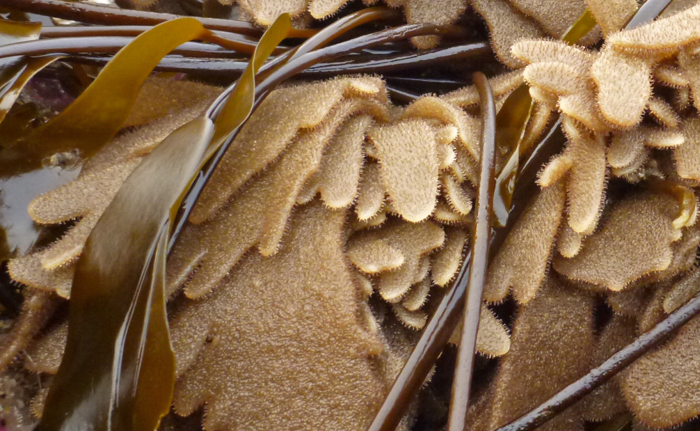 At very low tides beachcombers sometime run across Flustrellidra corniculata, the branched-spine or spiny leather bryozoan. They occur in the low intertidal and below, down to about 75 meters, which is 250 feet deep. In the intertidal zone they are members of the Laminaria community I described in Finding Yourself in the Infralittoral Fringe.