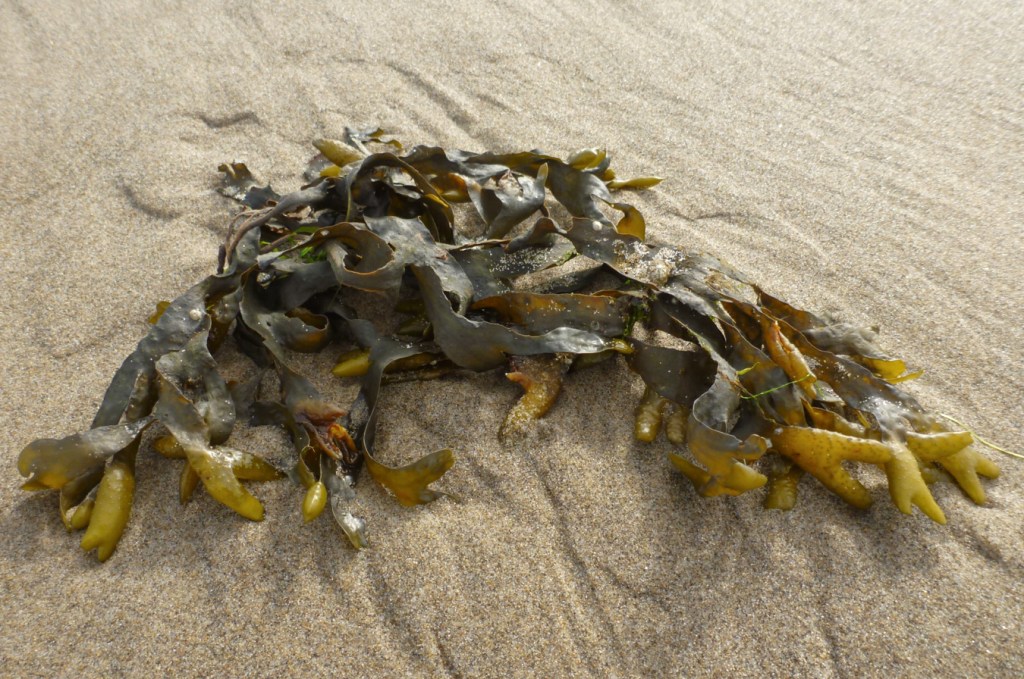 In previous posts, Eelgrass in the Wrack and Turkish Towel, I’ve written about plants and marine algae that commonly wash up on sandy beaches even though they live elsewhere. Rockweed, Fucus, is another example. Â Rockweed normally lives attached to rocky intertidal substrates (they don’t call it rockweed for nothing) in habitats ranging from estuaries to the open coast. Â The photo above shows what a clump of rockweed looks like it looks like when it’s freshly deposited on the beach. If you care about such things, I think all the images here are Fucus distichus. You’ll sometimes see it treated as Fucus gardneri.