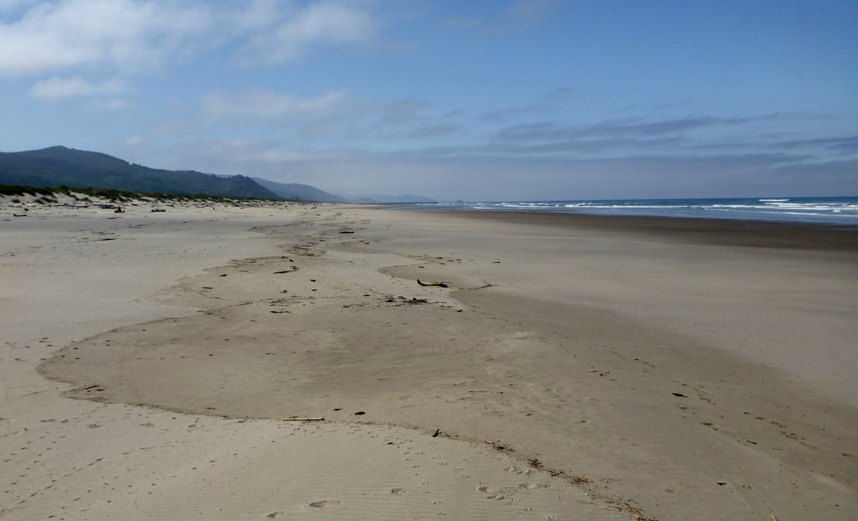 Here’s the beach where I found the Corbicula shell. So what gives? Corbicula is a freshwater clam with a vast worldwide range. The view above looks south to the mouth of a river that is probably inhabited by Corbicula. The most likely explanation for the occurrence of C. fluminea on ocean beaches is that they get mobilized by dredging or other activities upstream in their home rivers and wash downstream into the ocean, where some eventually wash up on the beach. In small rivers that’s not always a long trip because Asian clams range as low as the tidal freshwater reaches.