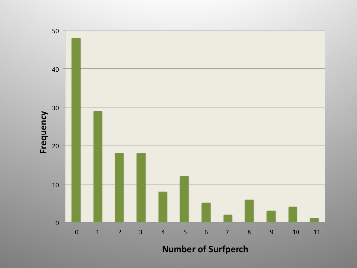 This figure shows sampling success in the 1-hour bouts over time. Bout 1 is the first sample way back in January 2009. On the other end of the x-axis, bout 154 was the last and most recent sample, taken in February 2013. It looks like either surfperch got more abundant over time, or I became more efficient sampling them. It would be fun to test these ideas, but I don’t have any idea how to do that. Keeping hour-by-hour notes allowed me to evaluate an index of abundance across the full range of the incoming tide.