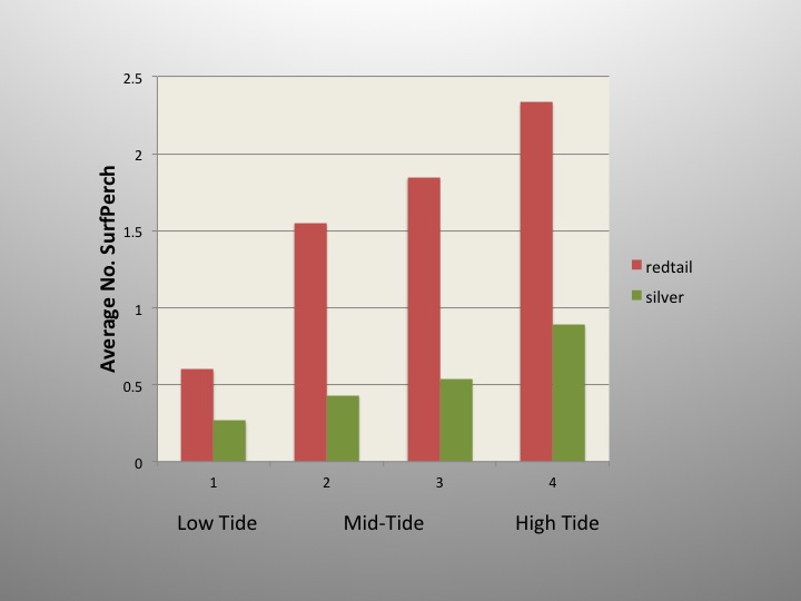 Here, you can see the average number of surfperch in the 1-hour samples at each stage of the incoming tide. Both redtails and silvers are more abundant, or more hungry, near the high end of the incoming tide. That’s something most experienced surfperch anglers might have been able to tell you without this study, but now you can see the evidence. Abundance rises across the cycle of the incoming tide in both species. If we are looking for evidence that the struggle for existence has shaped differences in how these species use the surf zone, we might have to look elsewhere. But where? One thing you might have noticed is that the positive slope of the line describing abundance and tide stage is steeper for redtails than for silvers. When we see lines with different slopes, eventually they must cross. Is there a crossing point and some different relationship on the outgoing tide?