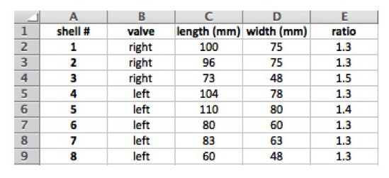 All the gaper images in this post are the fat gaper, Tresus capax. It’s the only gaper I seem to encounter, but as I have mentioned, there is another common gaper. The Pacific gaper, Tresus nuttallii, is the most common gaper in central and northern California. The shells of the two common gapers are slightly different in shape. Kozloff says the shell of T. nuttallii is generally more than one and a half times as long as it is high, while the shell of T. capax is generally about one and a half times as long as high. If Kozloff is correct, I can perform a test. The measurements for the eight complete gaper shells in my collection are: