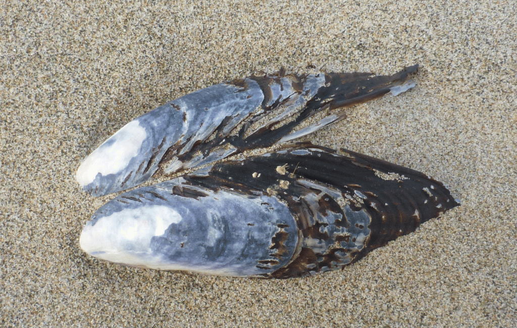 The shells featured above are all gaper clam shells. We think of gapers as bay clams but their shells can be abundant on exposed coastal beaches adjacent to river mouths. I’m guessing the shells of long gone gapers are transported to surf-swept shores by heavy flows in the estuaries. That’s probably most of the story, but some gaper shells found on open coast beaches may have an oceanic origin. It figures that Ricketts and Calvin would have something to say about this. Referring to the Pacific gaper, Tresus nuttallii, Ricketts and Calvin say: