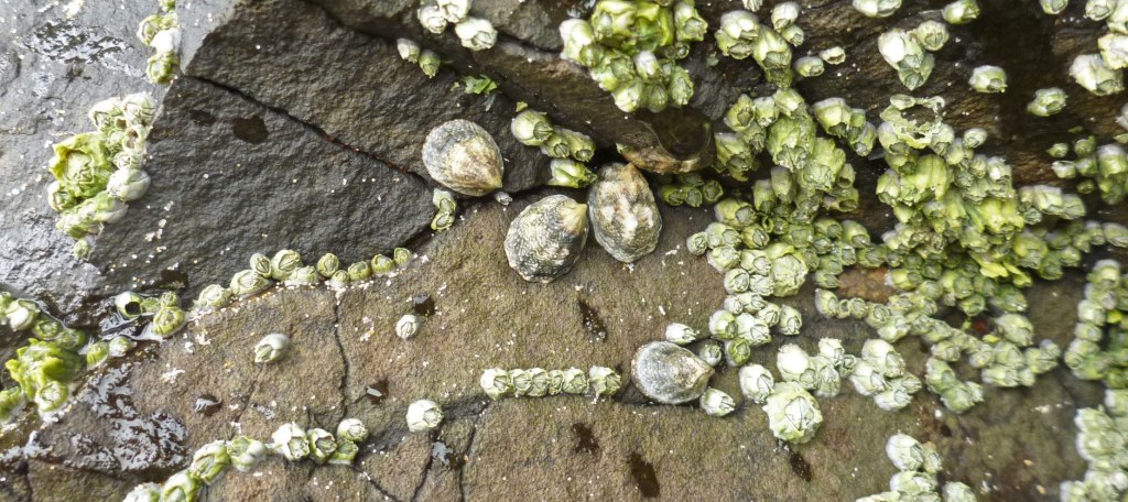 This high in the intertidal, there can be a lot open ground, and you’re not going to see a ton of species; dull coloration is the norm for the few common large ones. In the highest reaches of the supralittoral fringe, the commonly seen animals are small barnacles, limpets, and snails. Under some conditions, algae can be conspicuous. The acorn barnacles, Balanus glandula, on this rock seem to be inching skyward up the crevices. A little lower, they can form an almost continuous cover.
