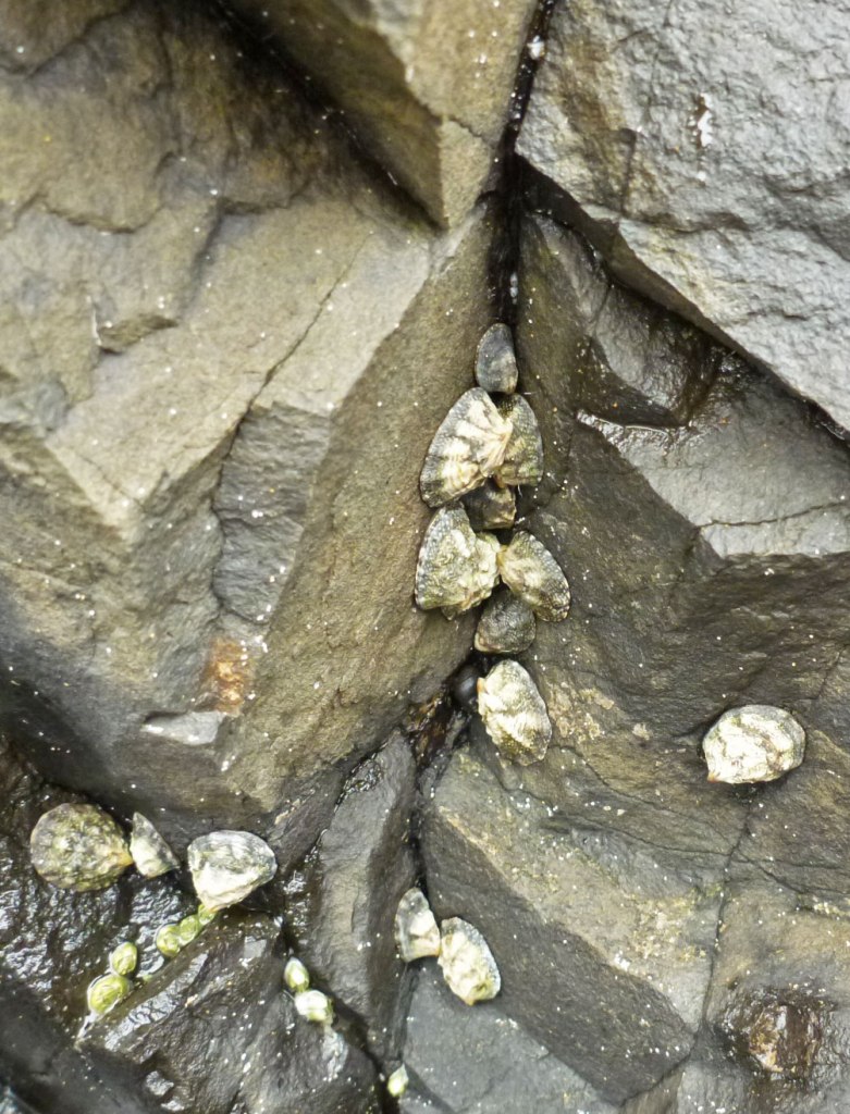 So supralittoral it is. Let’s continue exploring its upper fringes. On the highest occupied rocks, count on seeing barnacles, limpets, and periwinkles. The small set of photos below features acorn barnacles, Balanus glandula, and ribbed limpets, Lottia digitallis, but you’ll see a few checkered periwinkles, Littorina scutulata, in a couple of the images. You will also see lots of tiny white specks; those are baby barnacles. Spring, 2014 must have seen seas full of larvae and good conditions for settling.