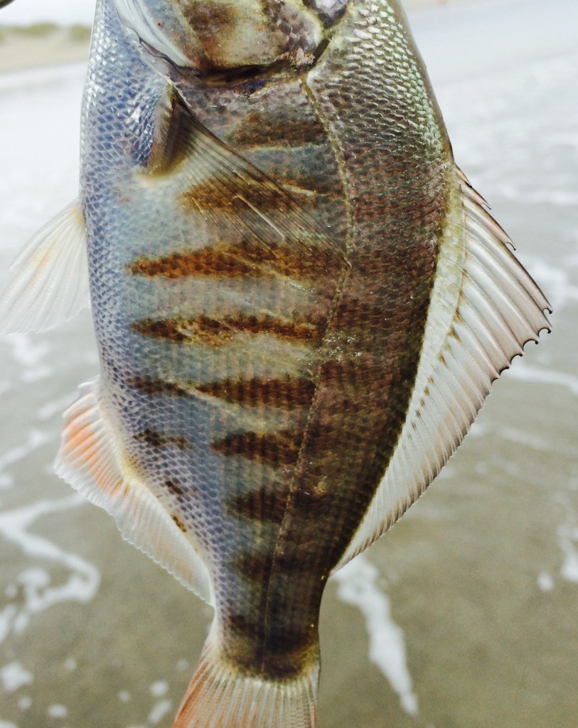 Once I hit the surf zone, I took this photograph of a small adult male redtail surfperch, Amphistichus rhodoterus. When I’m photographing a fish I’m balancing its prospects for a happy release against the time it takes to get the shot. Getting a shot I like always seems to takes longer than I hope, so you won’t see a lot of great fish shots on these pages. When photographing or viewing photos of surfperches and other surf-dwelling fishes, a quick index of how things are going, from the fish’s perspective, can be gotten from glancing at the fins and eyes. Look for erect fins and down-looking eyes, as in this fish.