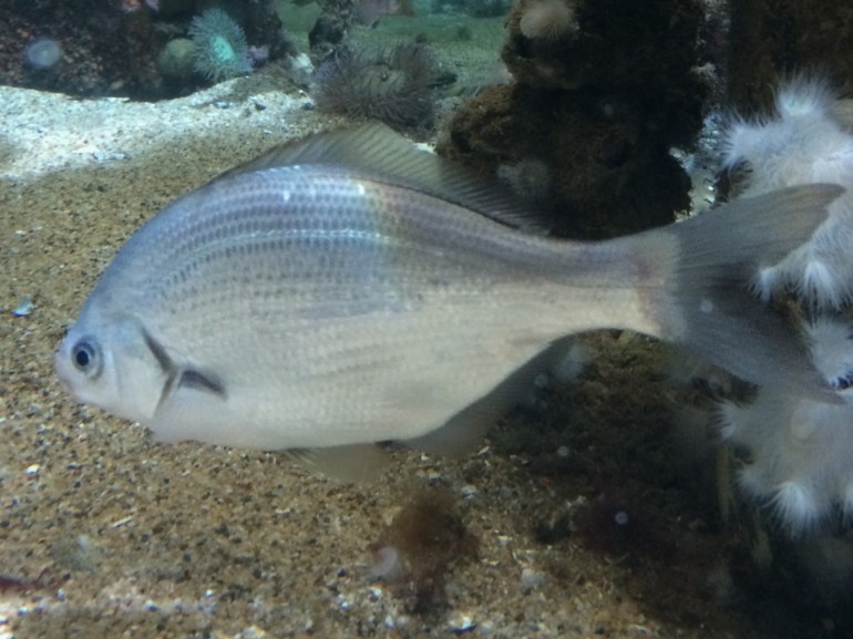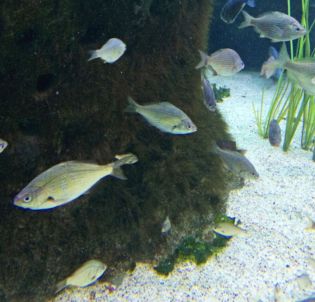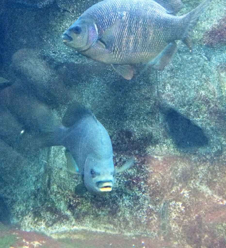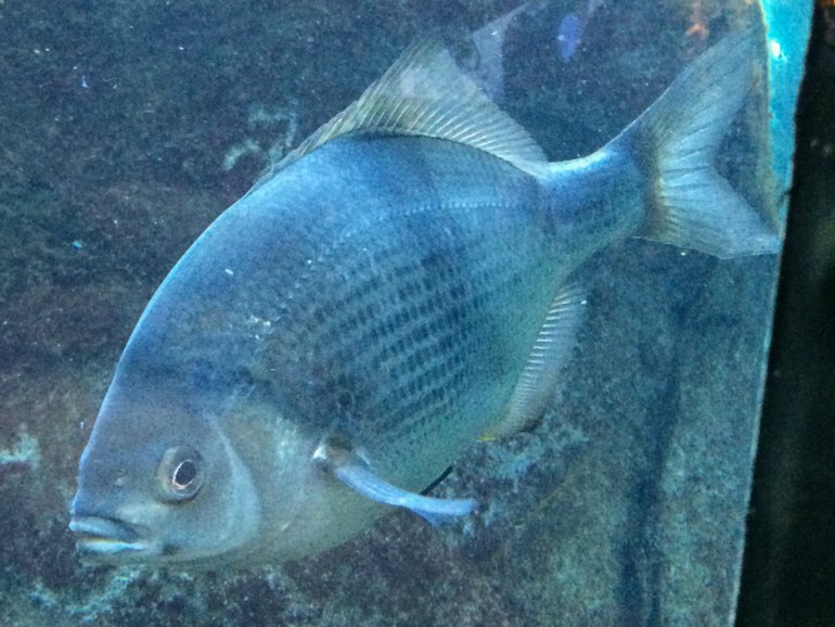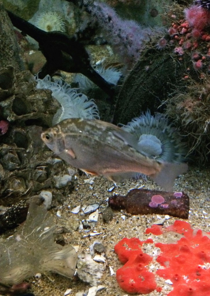 I was lucky enough to get a couple hours at the Monterey Bay Aquarium recently – spent the whole time staring at embiotocids. It was a great opportunity to connect with surfperches I don’t often get to see in the surf zone of my home waters in northern Oregon. Some of them don’t range as far north as my home beaches, and others don’t spend much time in the surf zone. I had my iPhone with me and here are a few shots of my encounters with the Embioticidae. I list these fish in the order I came upon them, and the common names and many of the diagnostic features follow Love’s Probably More Than You Want to Know about the Fishes of the Pacific Coast.