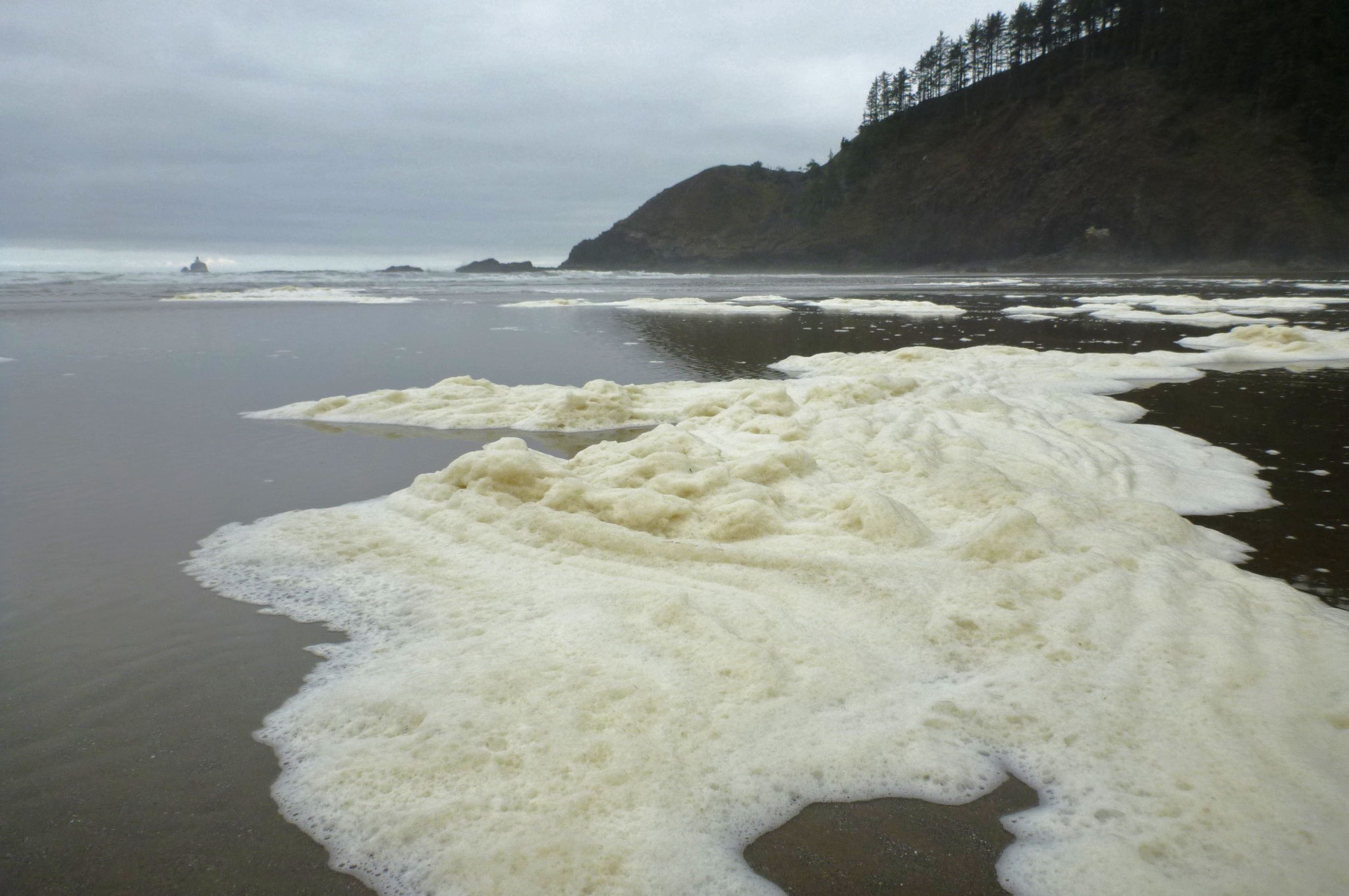 I now know that sea foam, also known as spume, occurs when turbulent seas shake up high concentrations of dissolved organic matter. A big source of dissolved organic matter is phytoplankton. Thus, a foamy surf zone may indicate an offshore phytoplankton bloom.