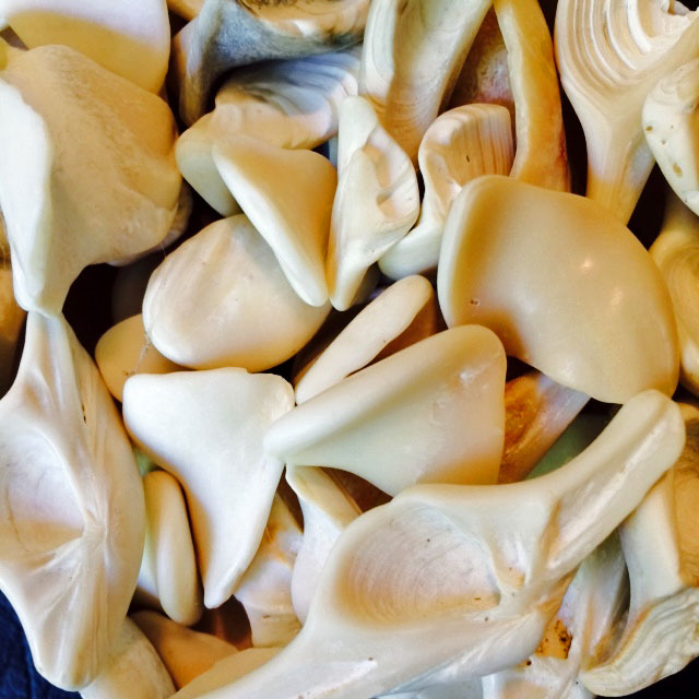 Did you know beach combers collect sand-polished clam condrophores? Chondrophores are internal spoon- or tooth-shaped projections of the shell in some bivalves. Gaper clams (Tresus) are known for their large attractive spoon-shaped chondrophores. A point of attachment for the internal ligament in live gapers, we seek them out on sandy beaches, long after their usefulness as origins and insertions has ended. I bragged about my collection back in July, 2014, when I had only a few- accumulated absentmindedly over the years because their pleasing look and feel was irresistible. Since I wrote Getting to Know Gapers, I’ve kept my eyes open for prime chondrophores, and I now boast a collection that overflows a large upturned red abalone shell. If you know Haliotis rufescens, you know that’s a lot of chodrophores. Here’s what we’re looking for.
