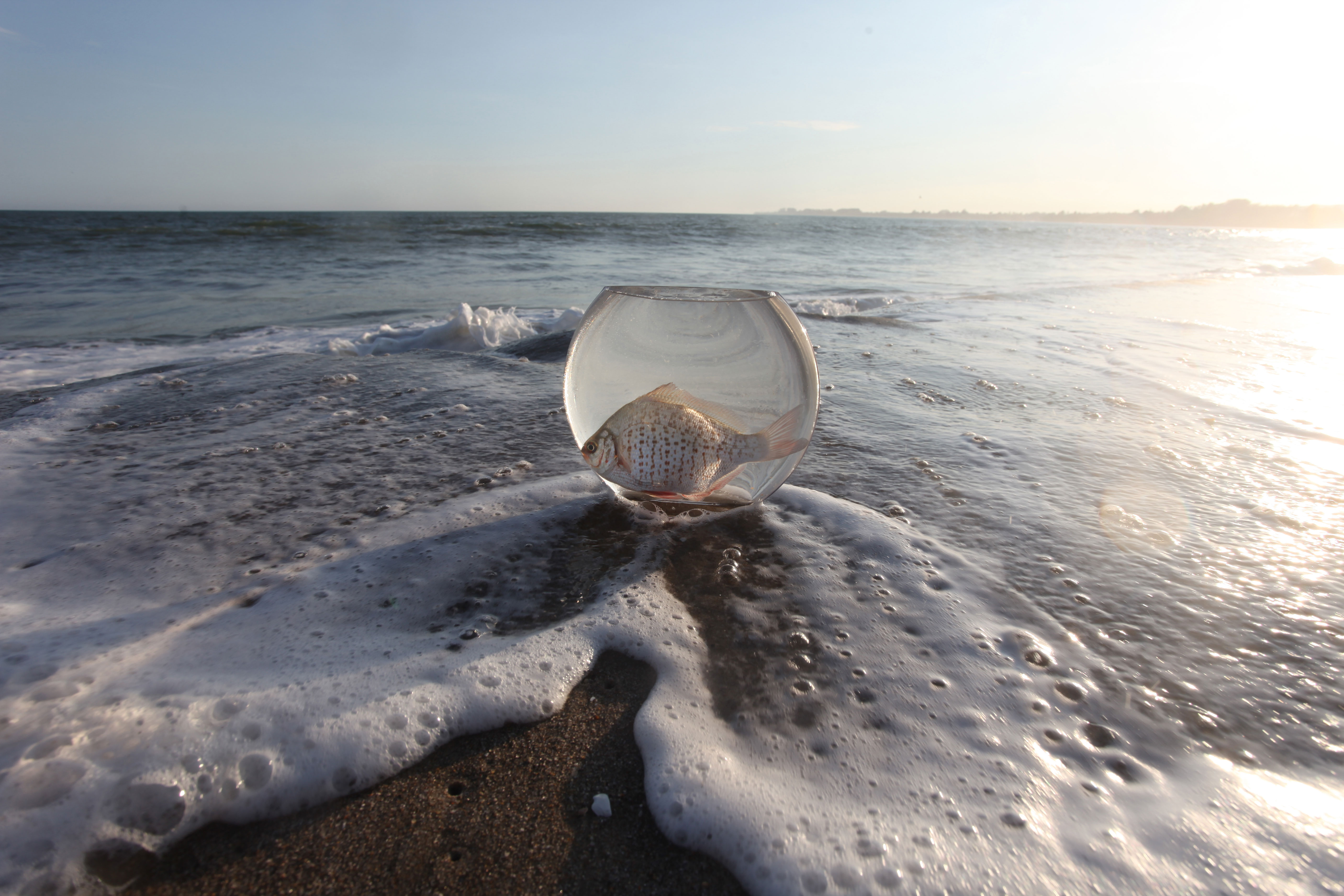 I set the vase on the very edge of the low cliff of sand I mentioned above, and lay down flat in the wet sand, waiting for the right wave to come in. When I lay flat it created the illusion of there being no cliff — that I was lying right in the surf. I knew the risk still was high that a too-big wave would come and take my vase and my fish — and I would have to be ready to spring upright, hold the camera high above my head if the wave came — but the next hundred waves behaved. Every dozenth wave would send a beautiful lens of foam coursing around the vase, and I snapped picture after picture, thrilled at how everything finally was coming together.