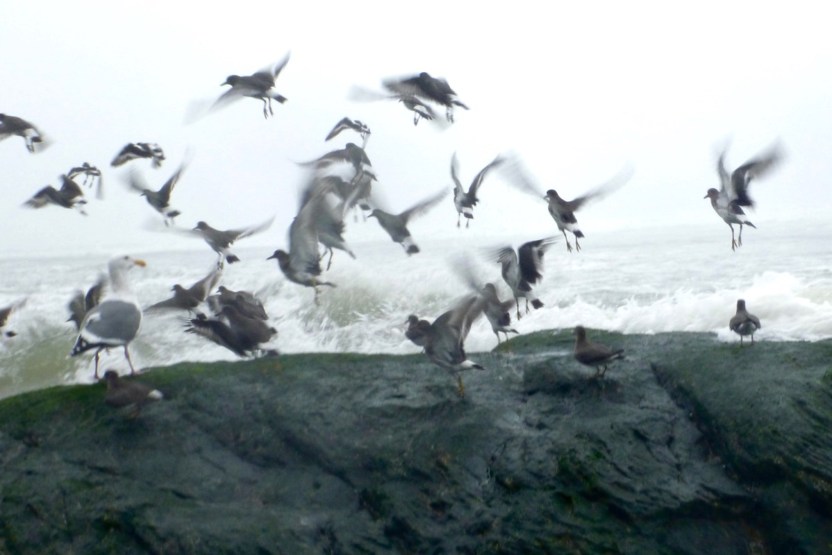 Surfbirds depart before a breaking wave, northern Oregon coast