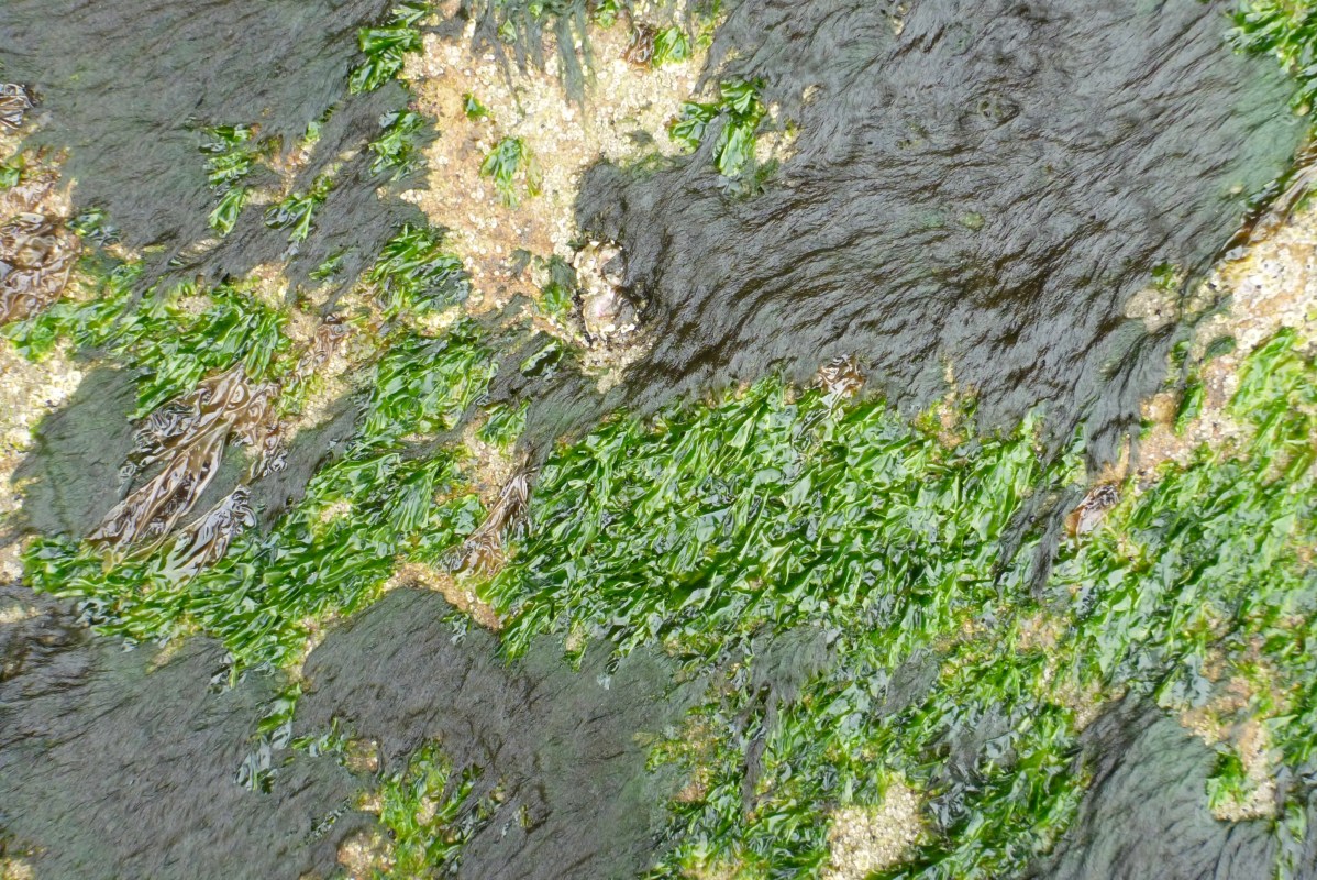 Swatches of marine algae on a rocky bed look like abstract art. The featured image for this post is unique because the algal patches that give it the abstract quality live on a roadbed carved into a rocky headland. The bed is exposed only at low tide. Being smooth, flat, and nearly level, it’s a rare surface in the rocky intertidal.