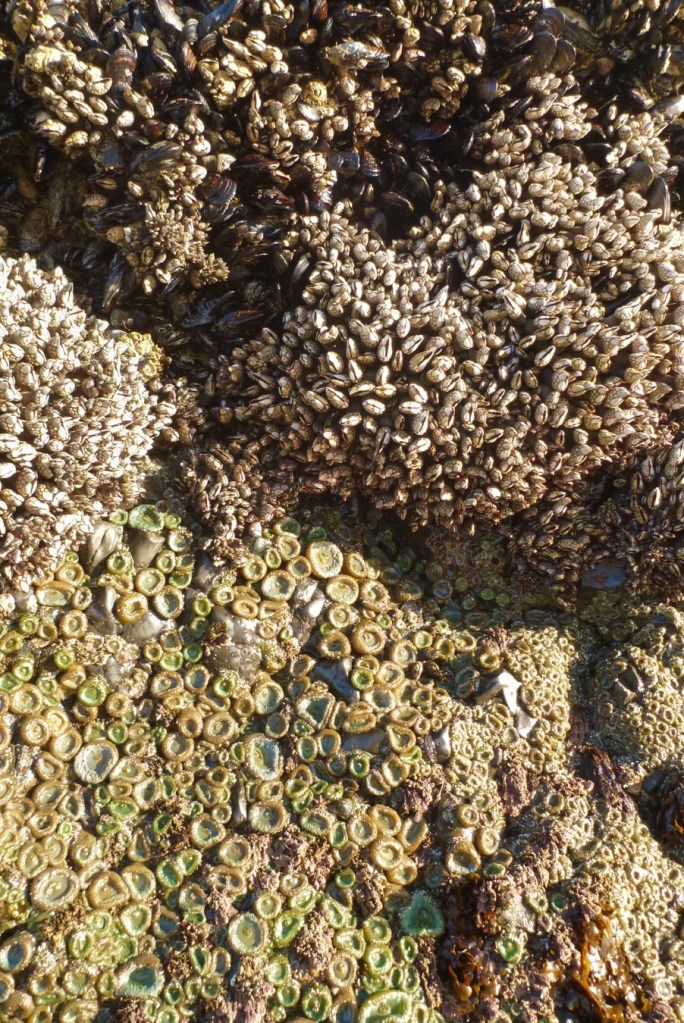 By 2016 gooseneck barnacles, Pollicipes polymerus, tip this landmark. Lower is a patch of Anthopleura elegantissima, gray and packed. Sharing the middle ground, Anthopleura xanthogrammica (green), and an algae (brown)- I don’t know that one. Mazzaella, at least I think it’s Mazzaella, blankets the lowest exposed rock.