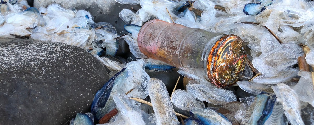 Closed tight, this empty glass jar floated as far as it could, washing ashore when it ran out of fetch on a cobble covered Oregon strand. It arrived in a beach cast of Velella velella, real-life professional drifters, so much so we call them by-the wind-sailors.