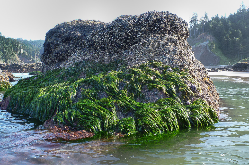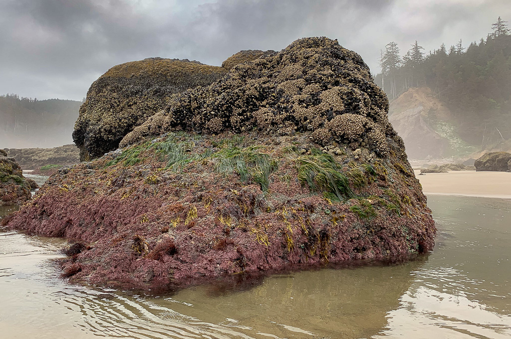 Below, is the first photograph I took of what is now one of my favorite northern Oregon landmarks. I say landmark, as far as I know, it’s not a landmark for anyone but me. It isn’t a single rock, it’s a pair. Allies rising up together on the lowest reach. Accounting for tides and surf conditions, they aren’t accessible very often. Seven years after this first encounter, in April 2013, I’m still drawn to the quirky charm of their barnacle encrusted mussel topknots. Tides permitting, I go back.