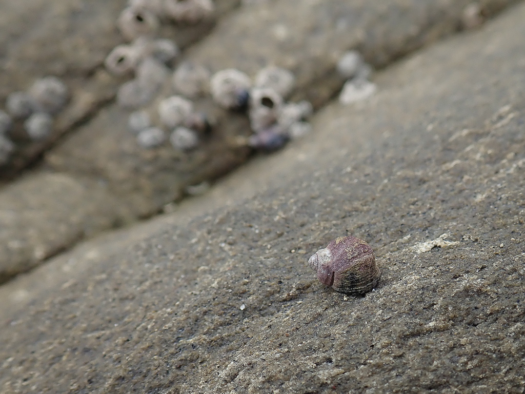 A periwinkle made it just so far under cover of last night’s humidity, then stopped. It’s going to be here a while. My human frame of reference says it looks vulnerable, but judging by the weathered shell this little gastropod knows what it’s doing.