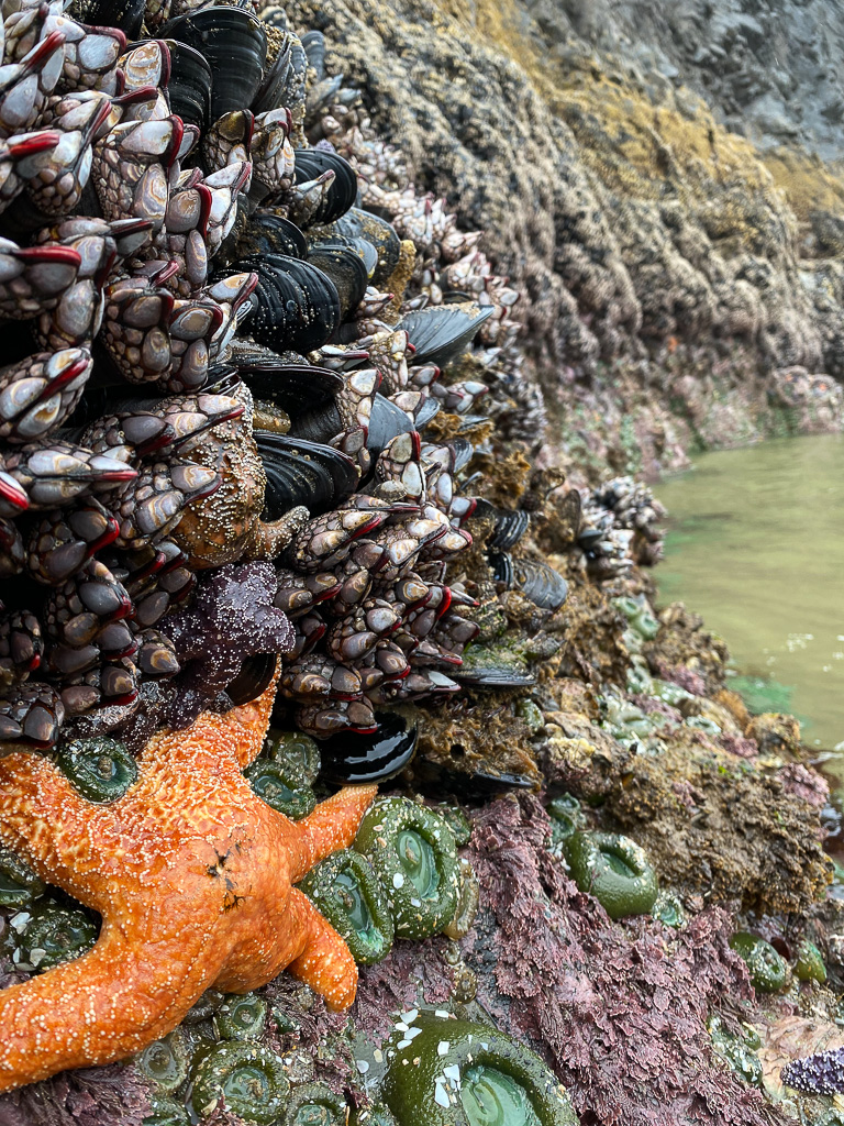 Stepping back, viewing the world from the lowermost horizon of the mussel bed (with the rocky intertidal’s renowned zones arcing off to the right), the impression of remarkable diversity and abundance is strong. By any measure, this scene is bursting with life.