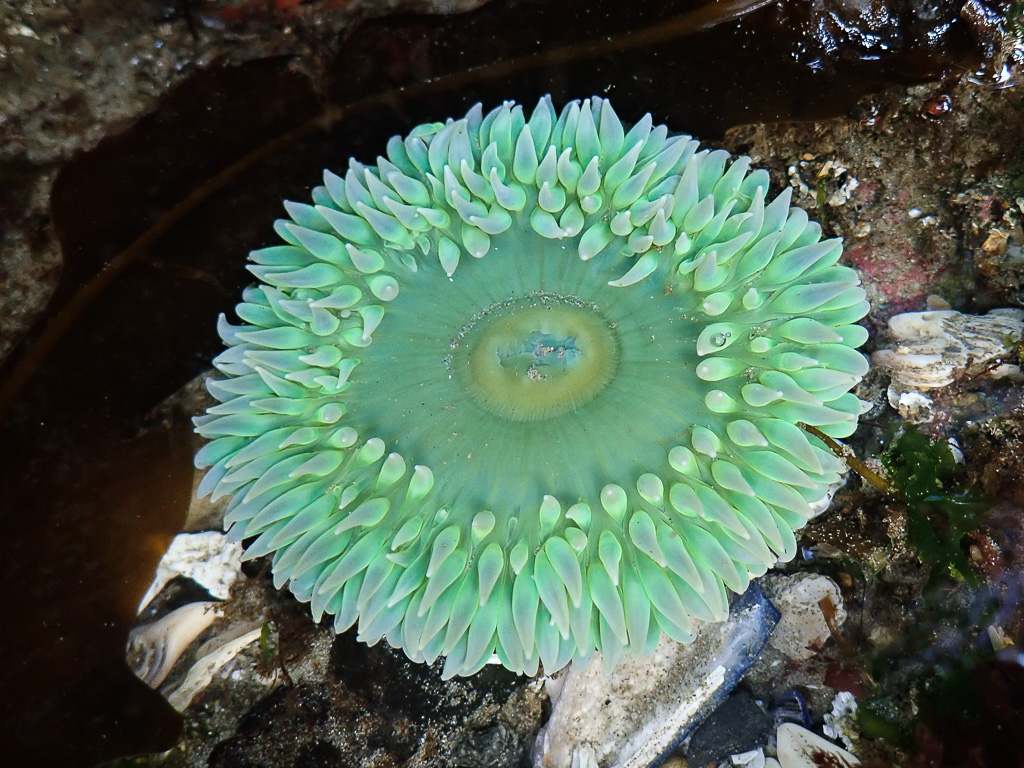 My symmetry party illustrates that examples of the main types of animal symmetry abound on the intertidal shore. Variations on the bilateral form are dazzling. There are fast movers among them and sessile forms too. Speaking of sessile forms, how about the radial crowd at the tide pools? Starfishes and anemones aren’t using their pizza pie symmetry for speed. Neither are the pelagic jellies; they’ve got good movement, but they do not speed, and being a bit at the mercy of the currents, they tend to get tossed up on the beach. So head over there. It won’t be long ’til you find a beachcast jelly. While you’re there, keep an eye out for symmetrically enigmatic ctenophores.