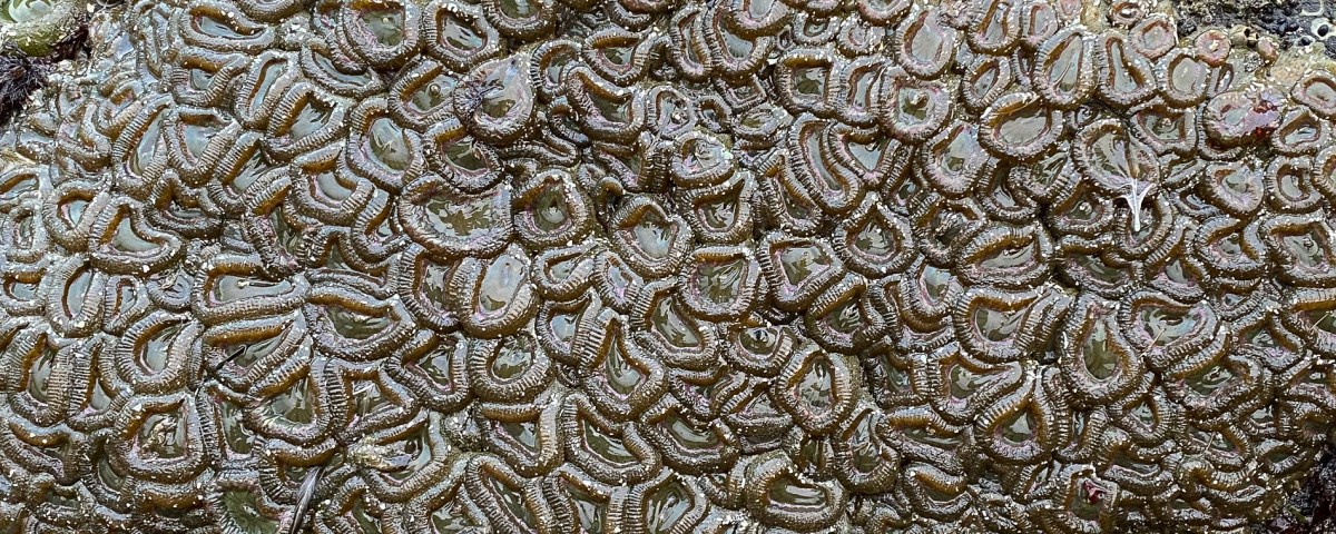A scene of tightly packed pink-tipped green anemones Anthopleura elegantissima ion a rock exposed by low tide. A thin band of space between two adjacent aggregations is featured. A few giant green anemones and a large Pisaster share the scene.