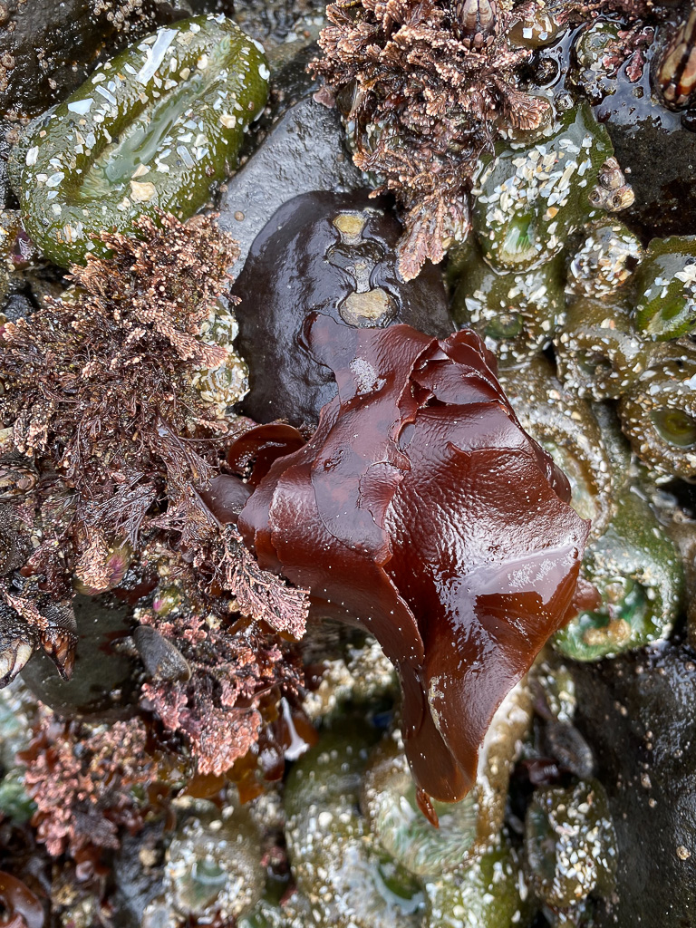 The low tides of late summer brought me a tidepool treat. I’d read about a connection between a red seaweed called slimy leaf, Schizymenia pacifica, and the Katy chiton, Katharina tunicata, but hadn’t seen it myself. I had seen Katy chitons decked out with various seaweed and animal hitchhikers, but I did not recall slimy leaf among them. By August, my eyes were open for Katies with slippery companions.