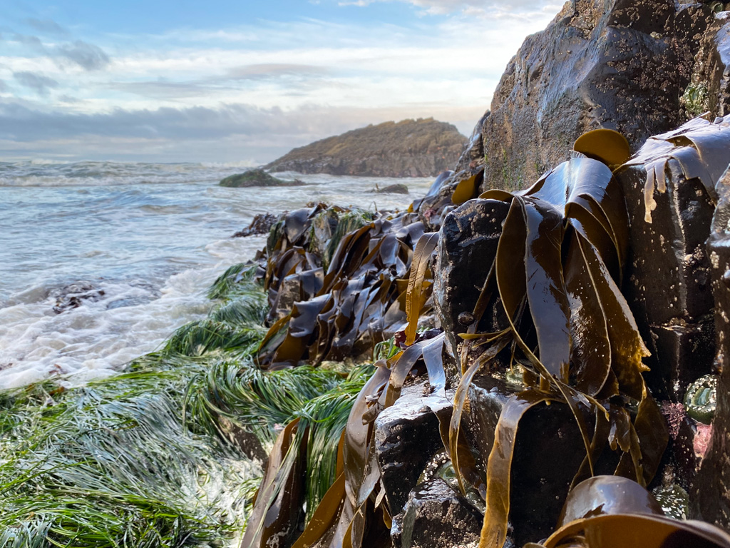 Glare and backlight from morning sun on Laminaria setchellii hanging over a vertical wall.