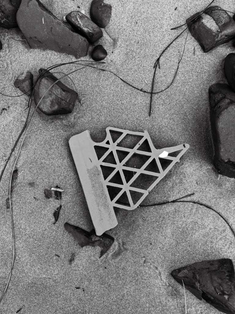 Fishing gear lost at sea washes ashore too. Plastic buoys, trawl floats, hagfish trap funnels, and trap door clips all end up on the beach.