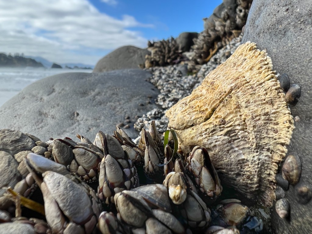 The intertidal creatures framed on either side by bare rock draw me into this scene, and the textures keep me there. Gooseneck barnacles, limpets, and a cute little periwinkle dot the foreground, where a looming thatched barnacle dominates. Its eroded shell’s texture is a sensual force and a site of attachment for tiny barnacles. The tube-like structures that give thatched barnacles their thatched look are hollow, at least in places, and you can see that here. In the background, Anthopleura and some more goosenecks.
