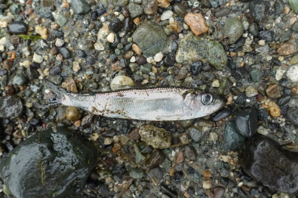 Juvenile salmonids are tough to identify on the beach, too. I showed photos of the example below to a few people who think about this kind of thing, and the consensus was chum parr, with some uncertainty. If you’re looking for help identifying juvenile salmonids, Pollard, Hartman, Groot, and Edgell (1997) is a valuable aid.