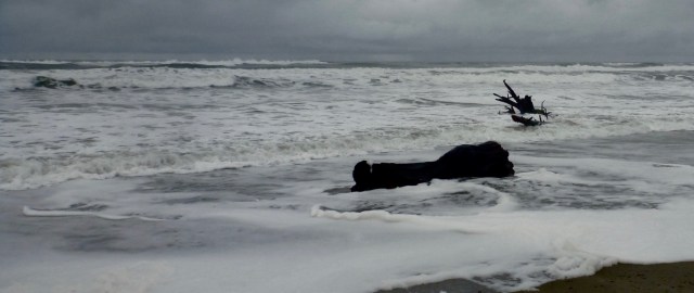 Wave crashes an old growth stump on a sandy beach. Wrack line and foredune in the background