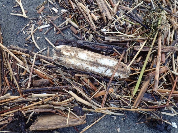 Winter surf deposits logs and erodes the backshoreDriftline dominated by wood and bark chips, a little plastic, and footprintsPlastic lighters are super common in the winter drftlineAll kinds of human-made material makes its way into the winter driftline How many ecosystems are represented here?The wad, a shotgun shell componentHistory lies at the foot of the backshore shelfLost beanieCockle, probably Clinocardium nuttalliiFish eggs among other drifted materialMermaid’s purse | big skate egg caseTennis ball, missing its fuzzCassin’s auklet, probablyAlways a lot of flip flops in the winter wrackMade, bottled, and sealed by Gallo in California | 4/5 QuartStudy in bleached bones | western grebe, perhaps?