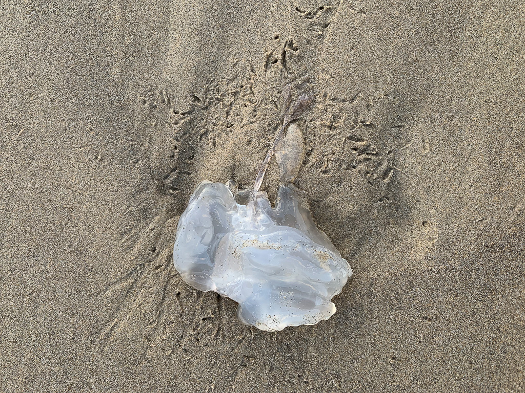 Moon jellyAn acquaintance of mineCockle fragmentTiny tidepool in a deceased DungenessSea nettleSea foamFat gaper, Tresus capaxTrying to decide if this looks like something (one in the mid ground, center left, looks like a dinosaur)BalanceAn eroding backshoreDrifted timber up on the backshore