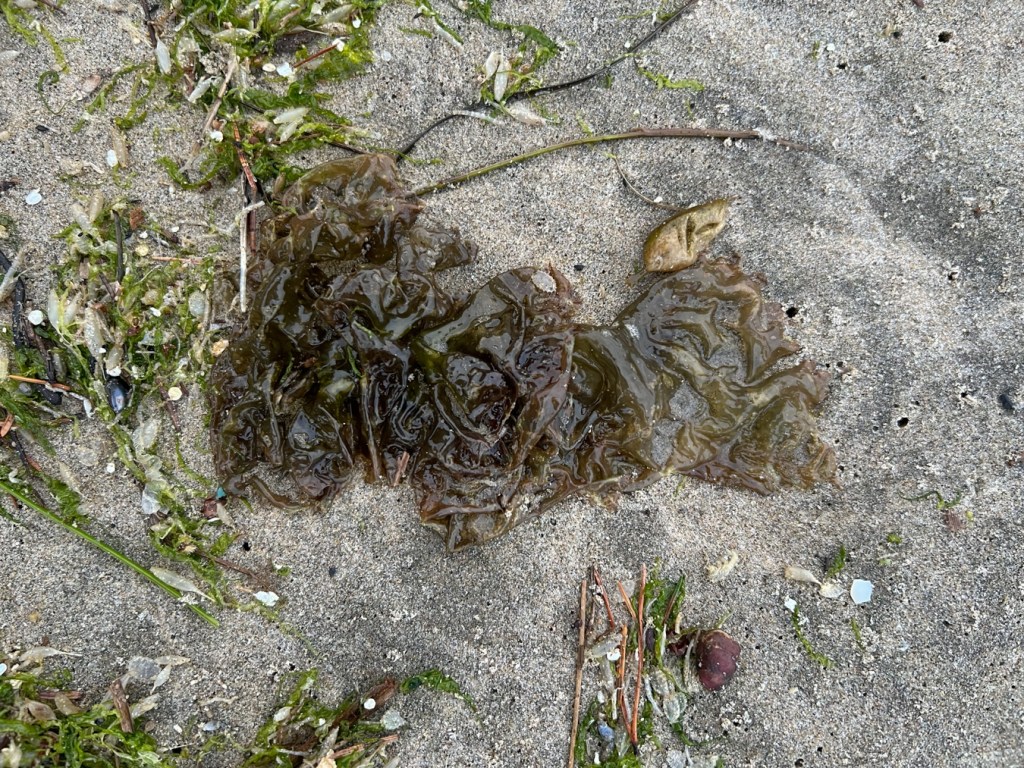 Any treasures out there?Trace of the tideBull kelp NereocystisEelgrass ZosteraWrack between the surf zone below and bare sand aboveRed fringe Smithora on an eelgrass bladeA delicate green epiphyte on eelgrassA beachcast jelly | Halimedusa? Drifter come to restCommon raven tracks near a carcassOysterFat gaper Tresus capaxSurfgrass PhyllospadixIt resembles an agate, but it’s a jelly fragment | Chrysaora?***