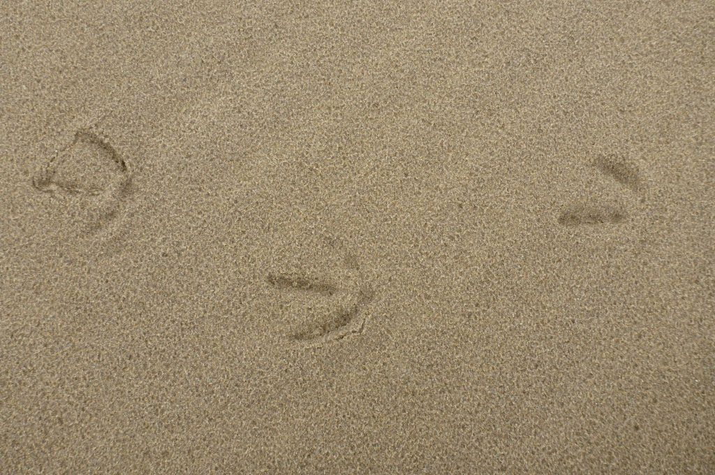 Unidentified alcidGull and raindrop tracks in the sandUnidentified alcidCommon murreCalifornia gull***