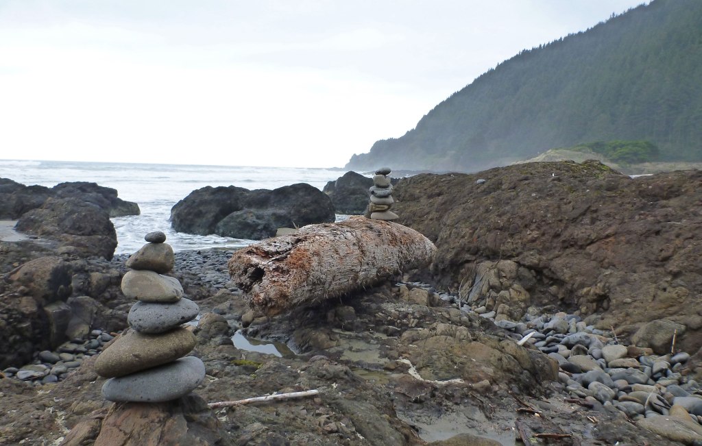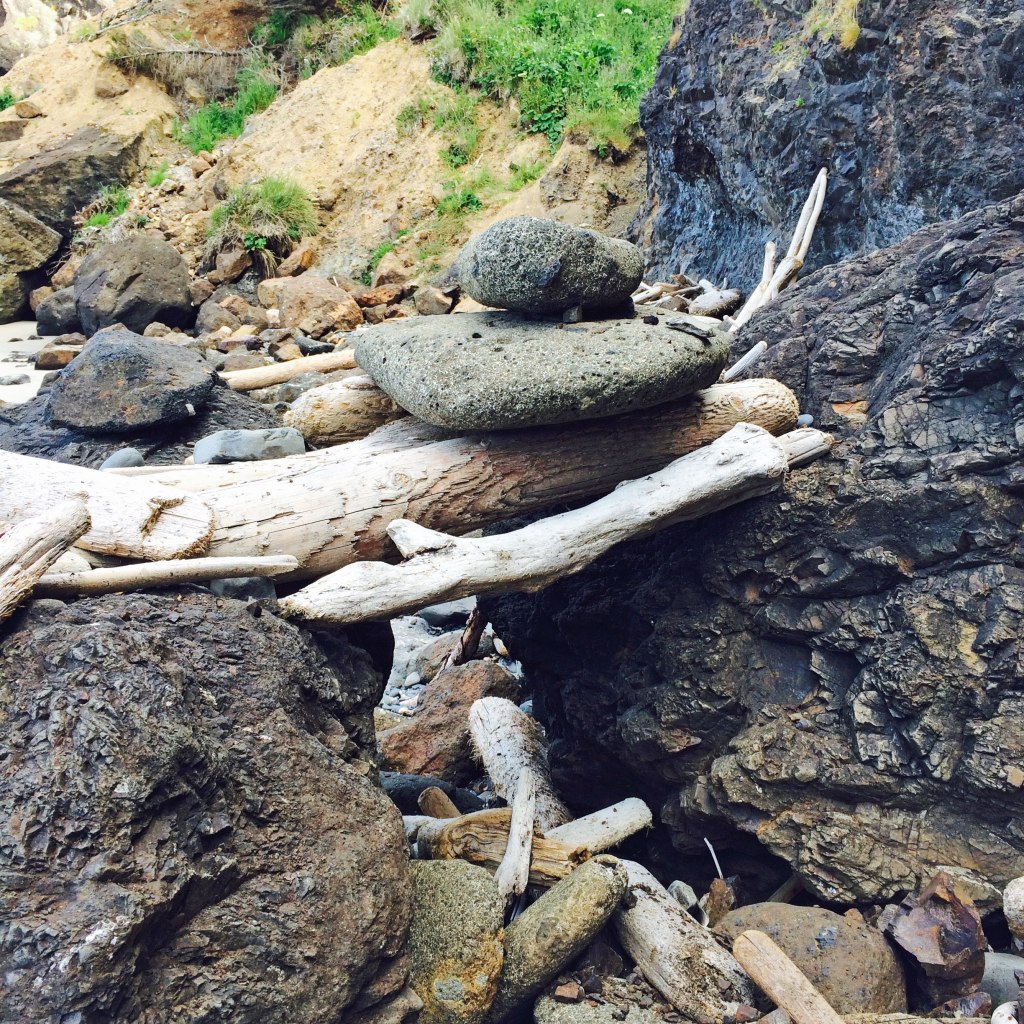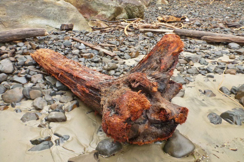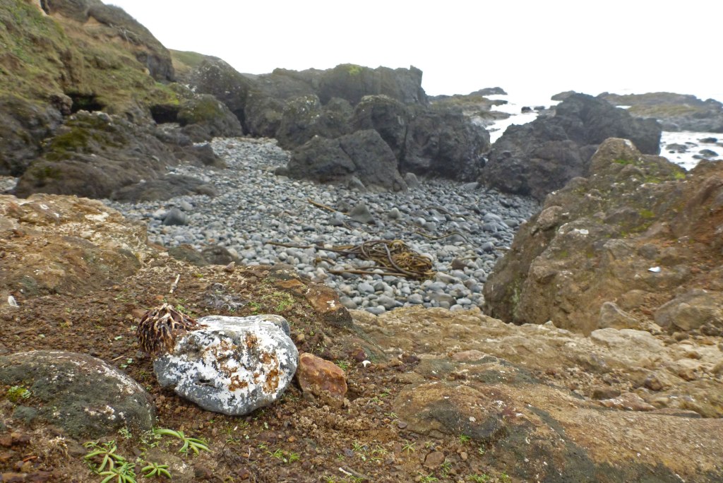 Conifer needles, brown and green, in last night’s driflineMelted plastic; I thought it was a rib boneFloatA line-up of older bull kelp stipes and pneumatocysts (floats); the blades are eroded awayGiant barnacle test embedded in a bull kelp holdfastCommon murre, non-breedingCairnPlenty of sticks up in the cobblesPlastic bagBeen knocking around a whileSize 8Pacific razor clamBull Kelp drift***