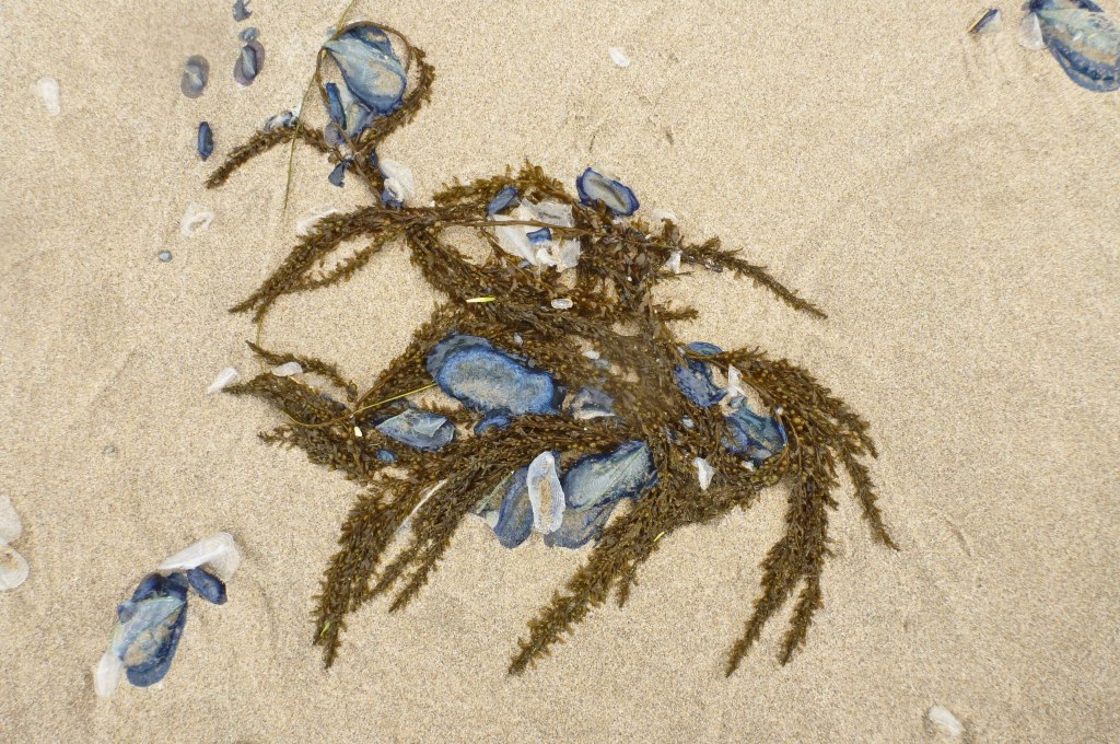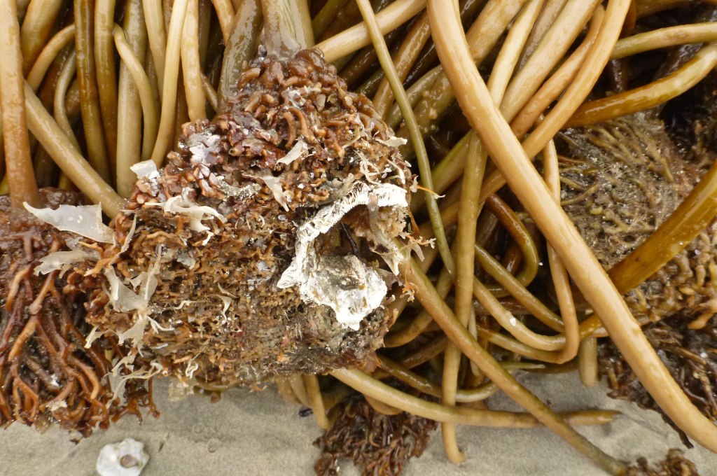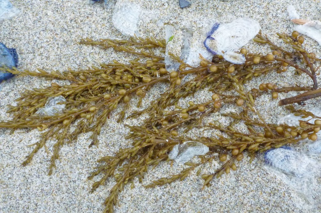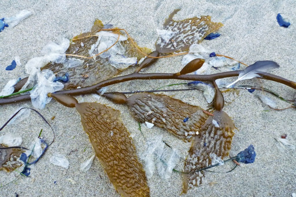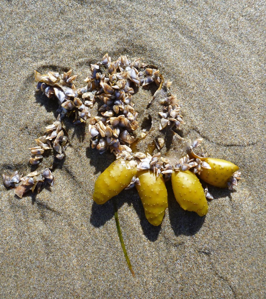 Fresh drift Egregia meziesiiMacrocystis has a float at the base of each bladeSmall pelagic barnacles on a Macrocystis bladeSea foamButterfly shell (chiton valve)Drift logVelella impression on a driftwoodWrackline puzzleCairnSargassum muticumLots of old and new Velella velella in the drift lineFucus and by-the-wind sailor in the drift lineDrift mass of Macrocystis; just a bit of Egregia meziesii in the mixMostly Macrocystis and a few bleached and fresh Velella velellaEgregia meziesii with floats***