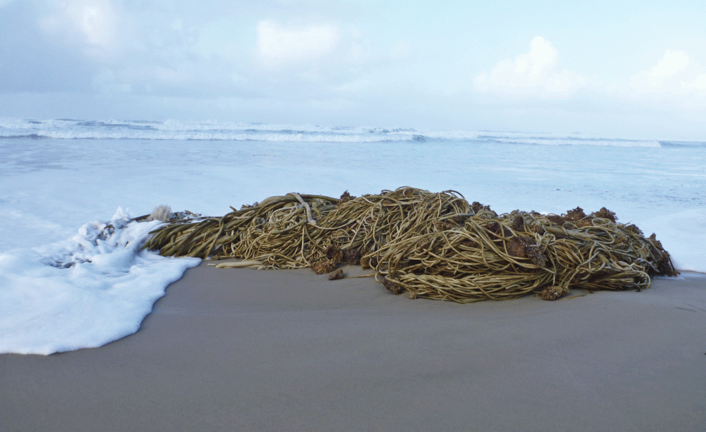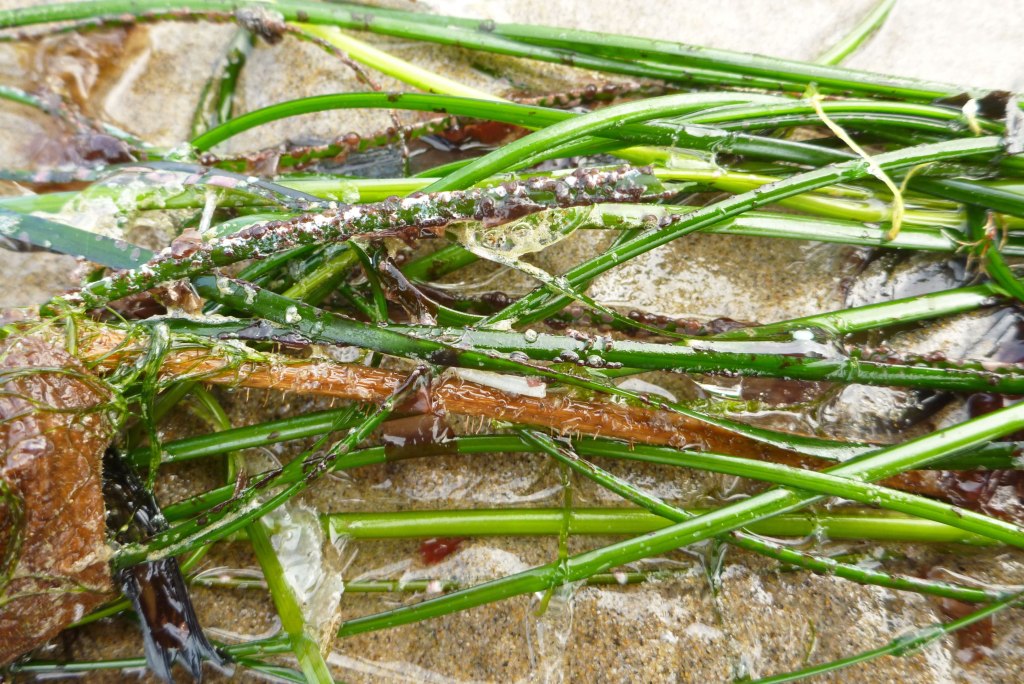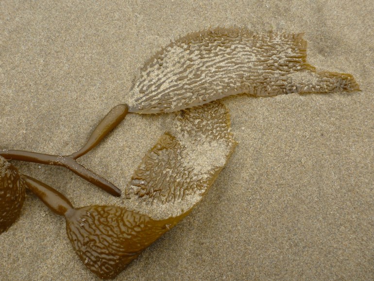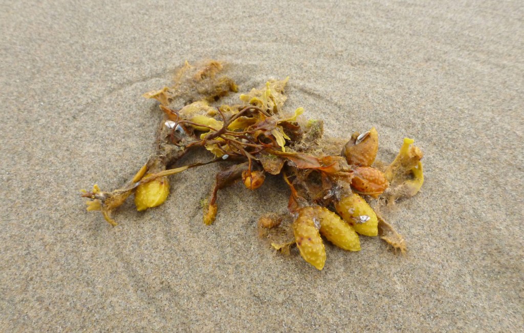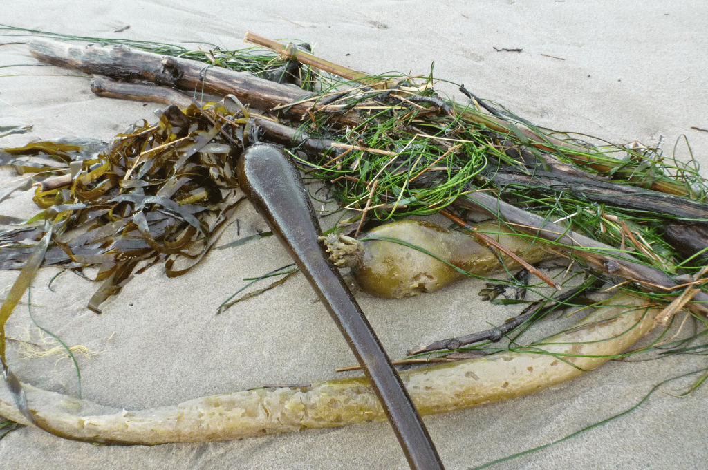 Fresh drift Egregia meziesiiMacrocystis has a float at the base of each bladeSmall pelagic barnacles on a Macrocystis bladeSea foamButterfly shell (chiton valve)Drift logVelella impression on a driftwoodWrackline puzzleCairnSargassum muticumLots of old and new Velella velella in the drift lineFucus and by-the-wind sailor in the drift lineDrift mass of Macrocystis; just a bit of Egregia meziesii in the mixMostly Macrocystis and a few bleached and fresh Velella velellaEgregia meziesii with floats***