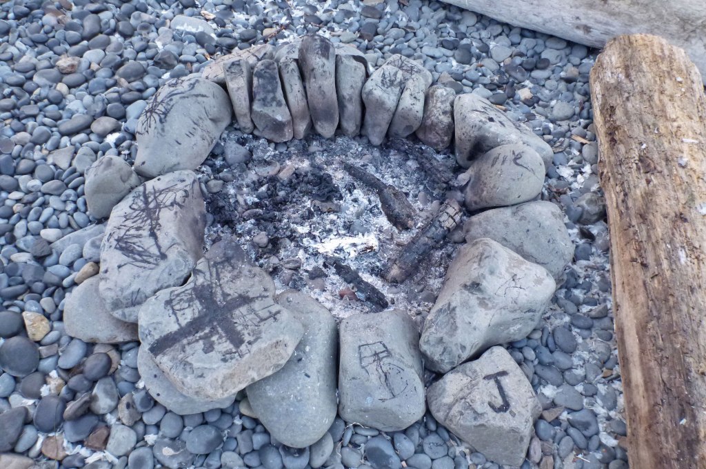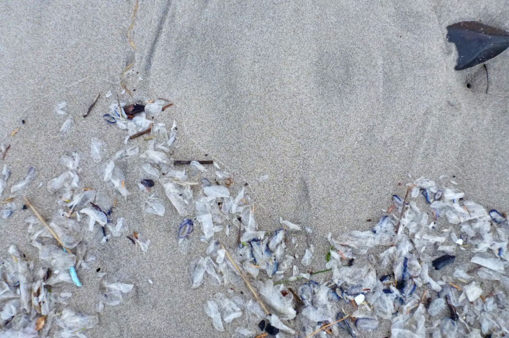 Bleached by-the-wind sailor skeletons carpet the drift line Eccentric sand dollar Dendraster excentricusBird’s nestAnti-staticTangleFetch?Newly arrived drift log, carpeted with LepasOld Velella, new drift lineFrequent in the wrackA few old Velella velella in the mixAlmost hidden among the bleached Velella velella testsA 9.5′ high tide kissed this fire pit at 1:45 am***