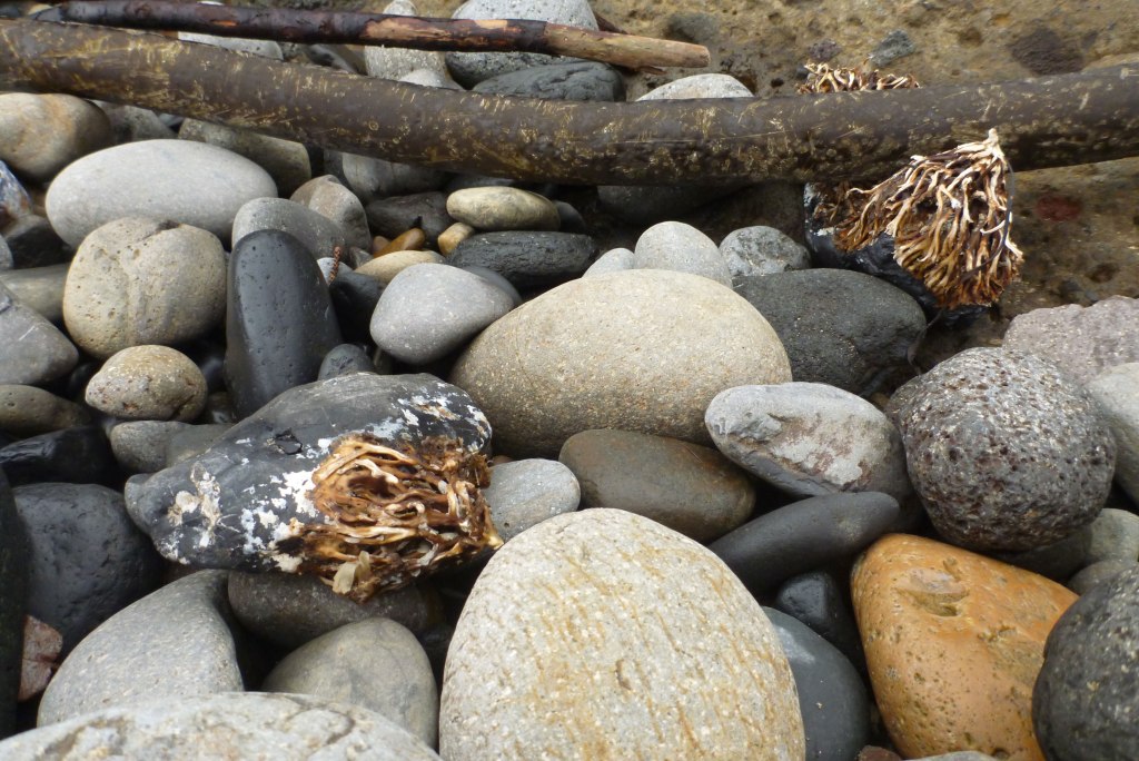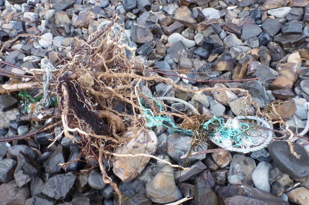 Cellophane tube worm casings (probably Spiochaetopterus costarum) and Sitka spruce needlesBig wrackBalancing actWrecked commercial crab gearGood-sized cobble dragged ashore on drift bull kelpBull kelp drift massBull kelp holdfastMore cobble dragged ashore on bull kelp – holdfasts still attachedThe white layer is dead barnacles smothered by accumulated summer sand ***