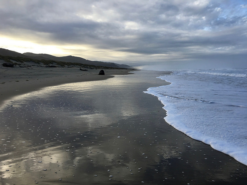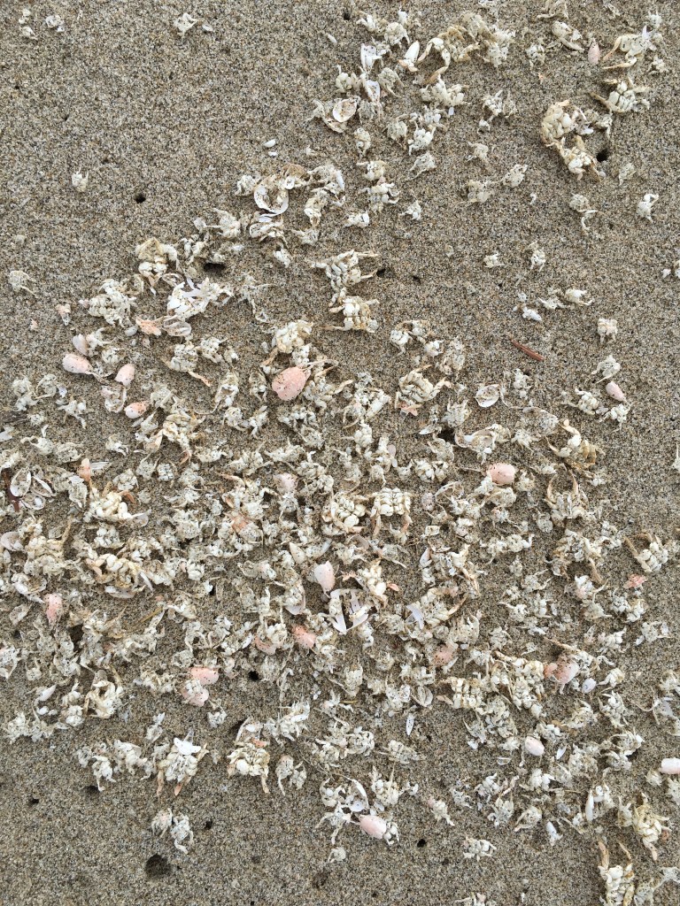 Waterfall to wavesCrazy quilt of Emerita trailsDrift logFork-tailed storm petrelHagfish trap funnelThe scent of decaying Velella velella is heavy on the drift lineDendraster excentricus test, crushedI don’t see this slender dark brown hopper much; Traskorchestia?Dungeness crab Metacarcinus magister carapace Barnacles on a Metacarcinus magister carapace Sand dollar Dendraster excentricus testPacific mole crab Emerita analoga exoskeleton***
