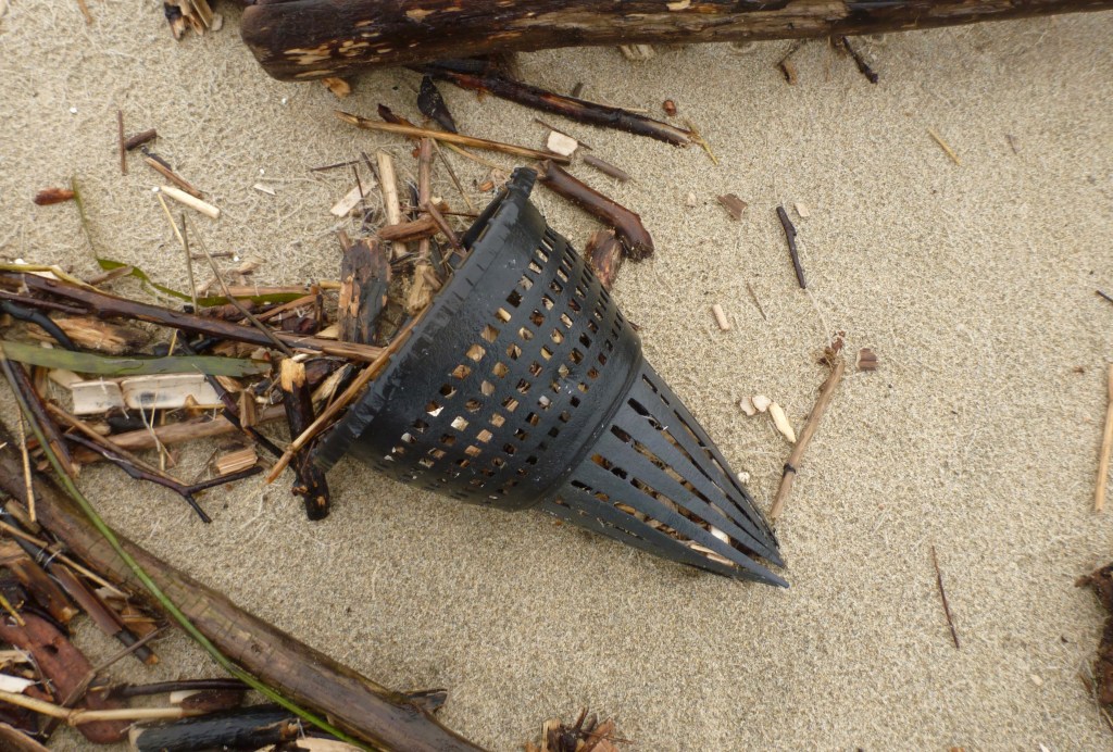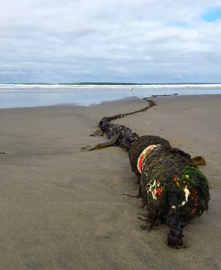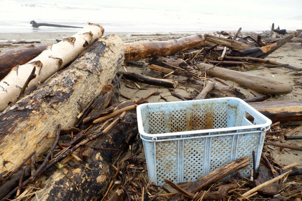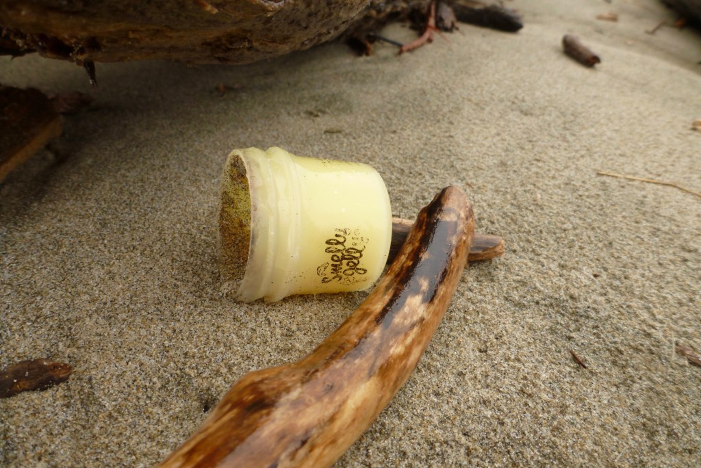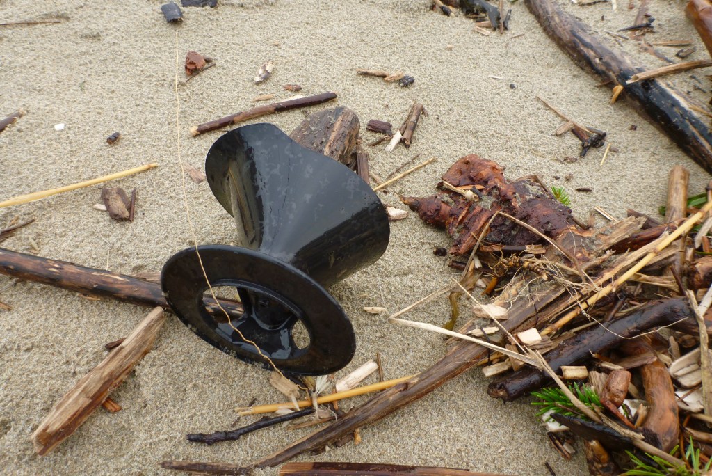 The wad – part of a shotgun shell and one of the most common items in the drift lineI’m curious, but probably not a good idea to taste thisHagfish trap funnelThe case – part of a shotgun shellLot’s of big wood on the shelfNew lumber, treated too!A crate for your wrack line treasuresCan you identify the language on this jar lid?Drip filterToo heavy to carry homeLighterLost dock – freshly treated lumberStyrofoam remainsHeinz Ketchup Smelly Jelly , an attractant Track in the wrackWorld traveling poly Jerry canWorld traveling liquor bottle with no message, just a head of wheat insideWhole tree covered in barnaclesLil’ Corky in Fire Tiger finish – part of the terminal tackle for steelheadTangle of line in a tangle of rootsSea foam – a product of phytoplankton breakdown***