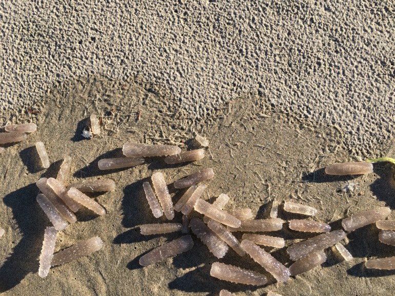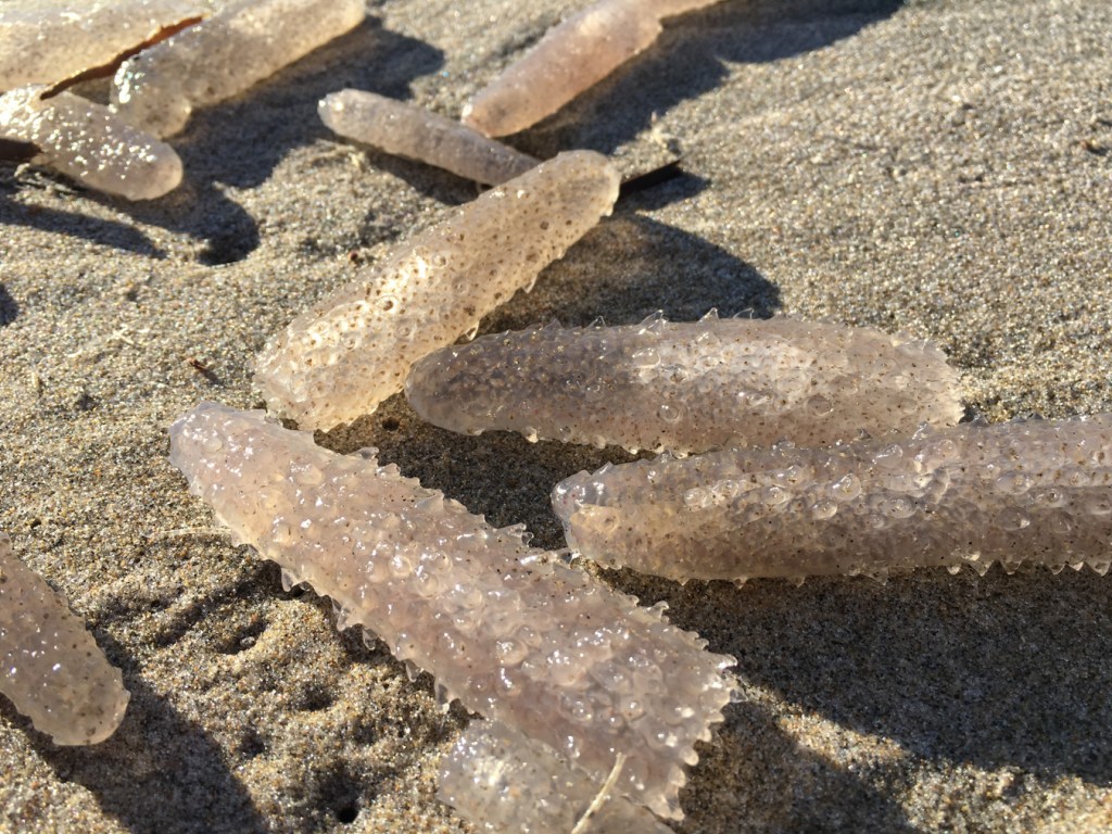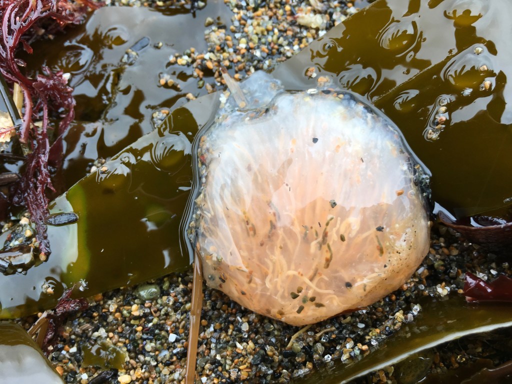 Pyrosomes are pelagic colonial tunicatesA startling pyrosome beach castThat’s a lot of pyrosomesEach pyrosome is a colony of zooidsDrift feather boaDrift bull kelpHigh tides and swells pushed drift bull kelp onto the backshore shelfAlmost high tideA drift line littered with pyrosomes***