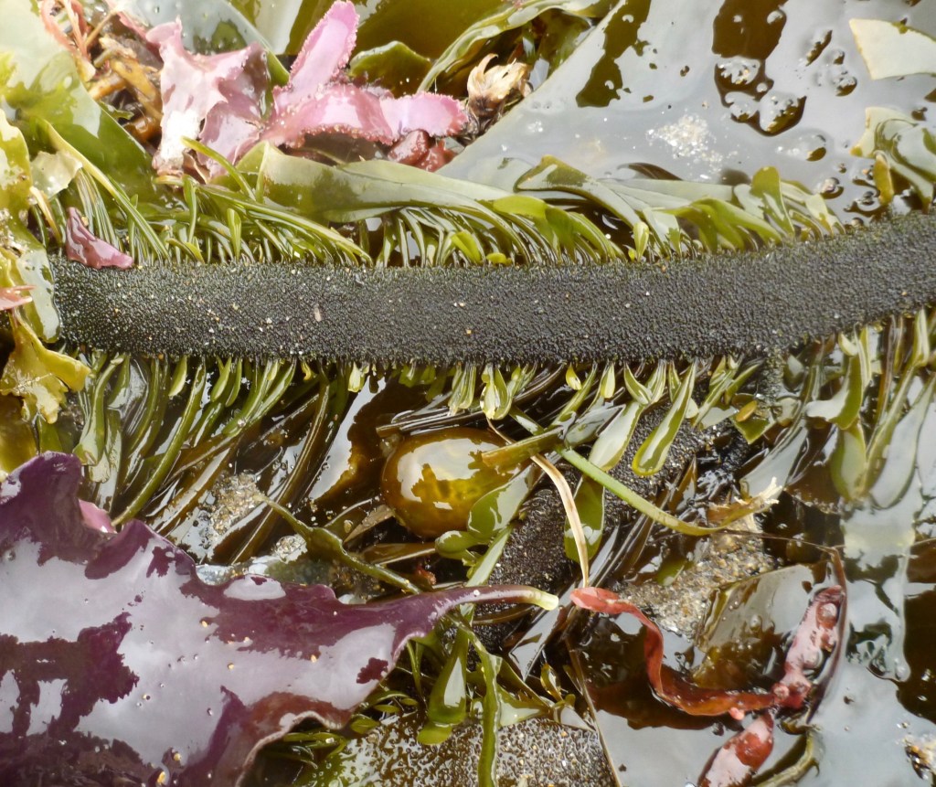 Mostly crustacean molts; raindrops and footprints above the lineClouds and rocks in the mirrorDrift bladder chain Stephanocystis osmundaceaBaby bull kelp Nereocystis luetkeana***