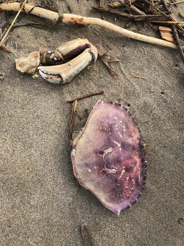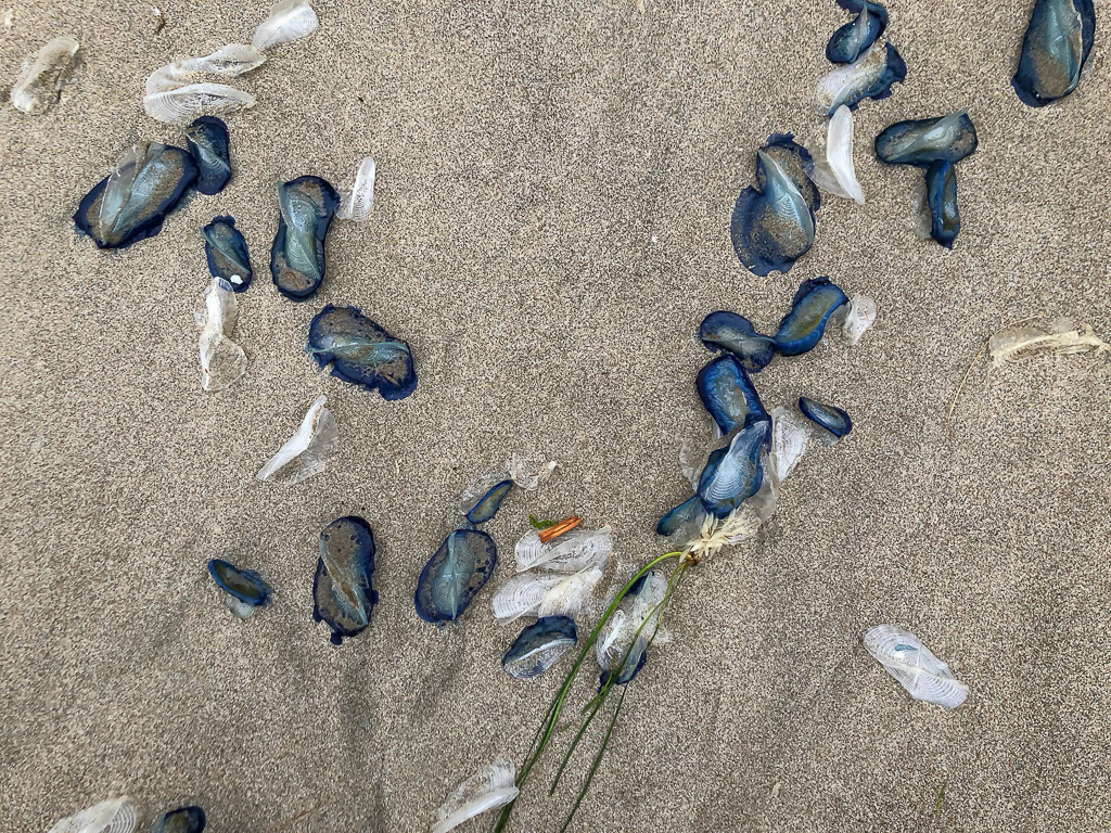 Blue buoys, Dosima fascicularis, on a spent by-the-wind sailor Lone by-the-wind sailorToo much of thisMix of fresh and bleached Velella velellaFreshly arrived carboy inhabited by lots of distressed LepasCalifornia mussel, Mytilus californianusDrifted FucusI’ve always called these tellins, but I’m not positiveThere’s a seascape out thereDungeness pinching claw***