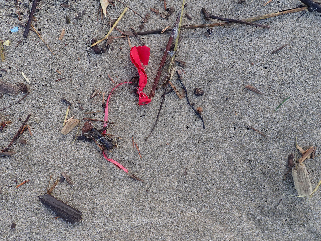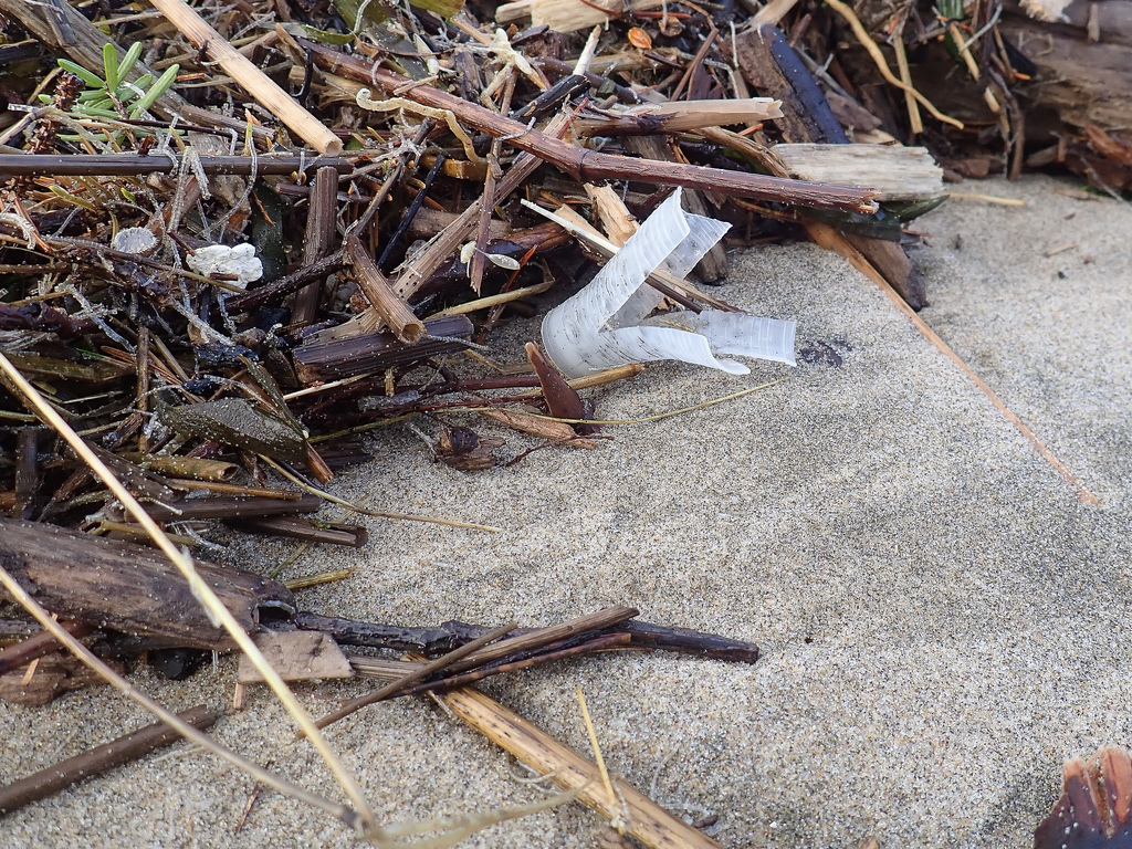Bull-kelp nori, Pyropia, on a drifted bull-kelp stipe Drift bull kelp, Nereocystis luetkeanaDrift line dominated by the partially bleached remains of drifted Velella velellaLugged floatNorthern fulmarDrifted bull-kelp, Nereocystis luetkeanaDelicate red epiphyte on bull-kelp stipesAlmost washed away in the swashRegugitated capitulum, Pollicipes polymerus | Gulls eat these and barf up the shellsThis trap won’t fishRough keyhole limpet, Diodora aspera | just the shell, now go find a live one on the rocks!What’s out of place here?Purple olive’s a show off***